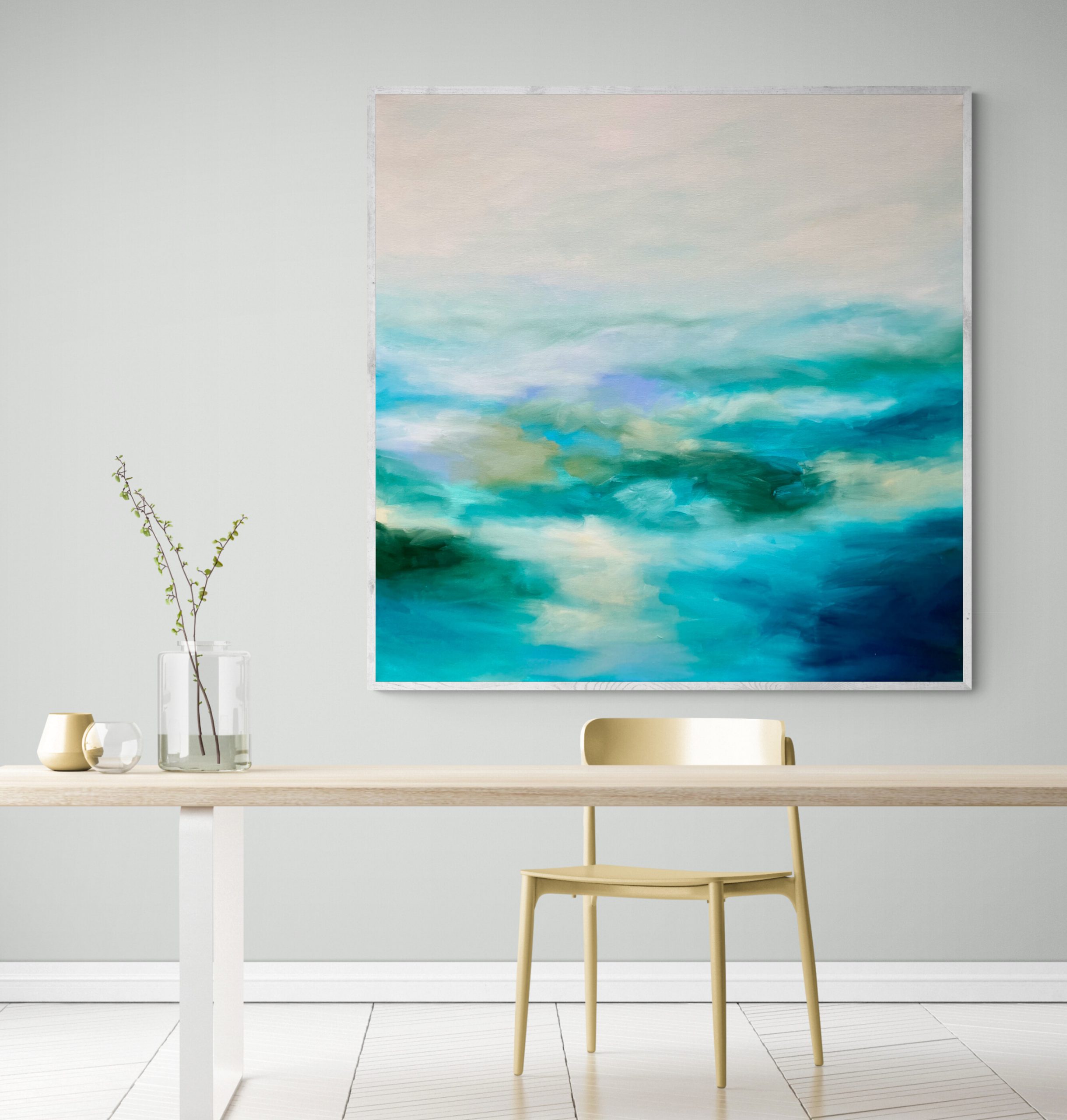 Seaside Blues by Theo Papathomas – a painting celebrating colour and light. A very soothing and tranquil painting where sky, clouds, sea, water come together to create this beautiful harmonious landscape. Capturing the beautiful blue cool colours of the sea against the light colours of the sky. Clouds covering the sea .Painted in a very expressionistic way with acrylic paints and it doesn’t come with external frame. I tried to create so much depth in the painting .A very harmonious composition of colours and forms that makes it a very poetic and meditating painting . The painting is signed and dated 2022 at the back and comes with a certificate of Authenticity.