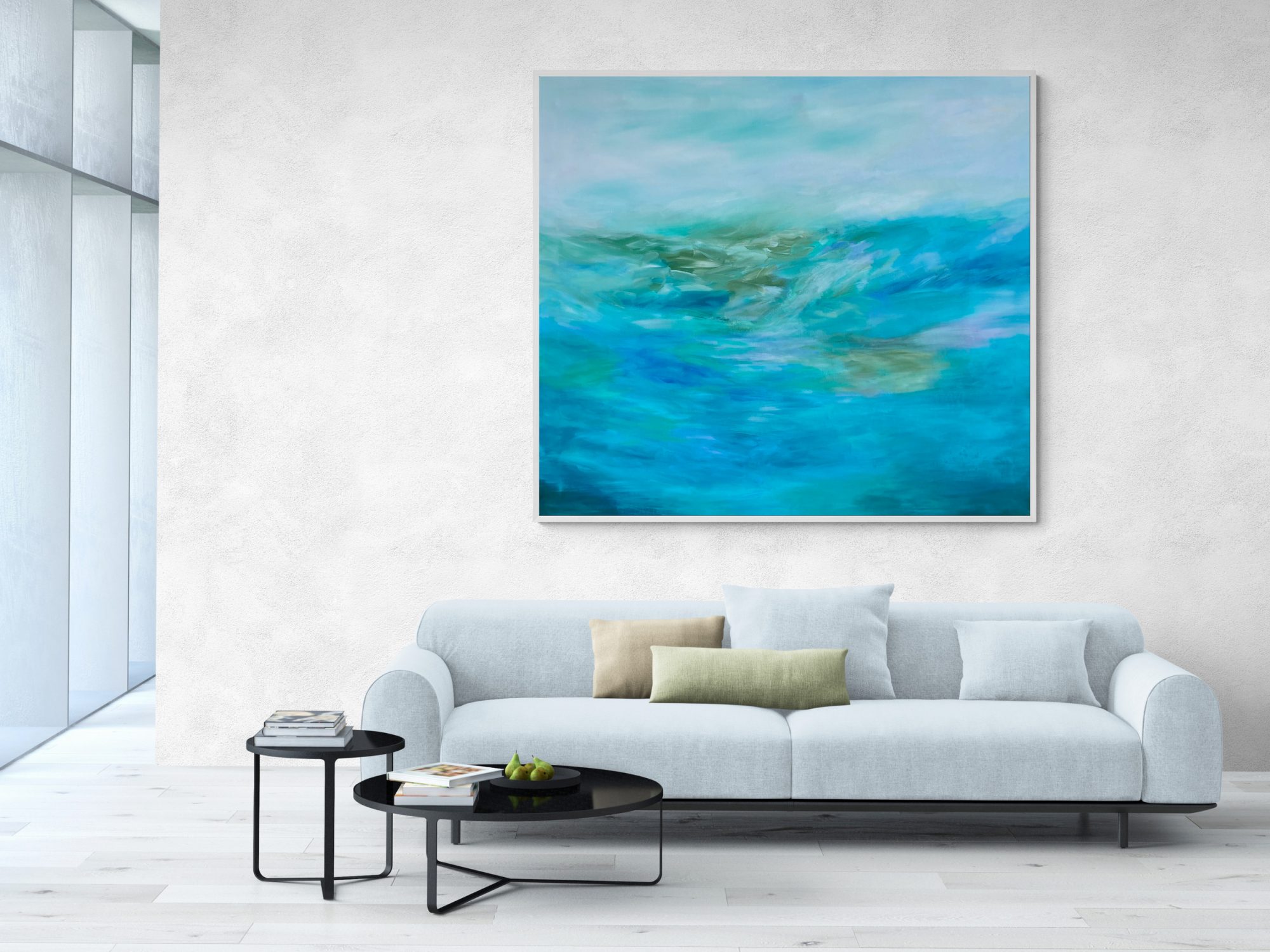 Seaside Dreams by Theo Papathomas a painting celebrating colour and light. A very soothing and tranquil painting where sky, clouds, sea, water come together to create this beautiful harmonious landscape. Capturing the beautiful blue cool colours of the sea against the light blues of the sky. Clouds covering the sea and hills.Painted in a very expressionistic way with acrylic paints and it doesn’t come with external frame. I tried to create so much depth in the painting .A very harmonious composition of colours and forms that makes it a very poetic and romantic painting . The painting is signed and dated 2021 at the back and comes with a certificate of Authenticity.