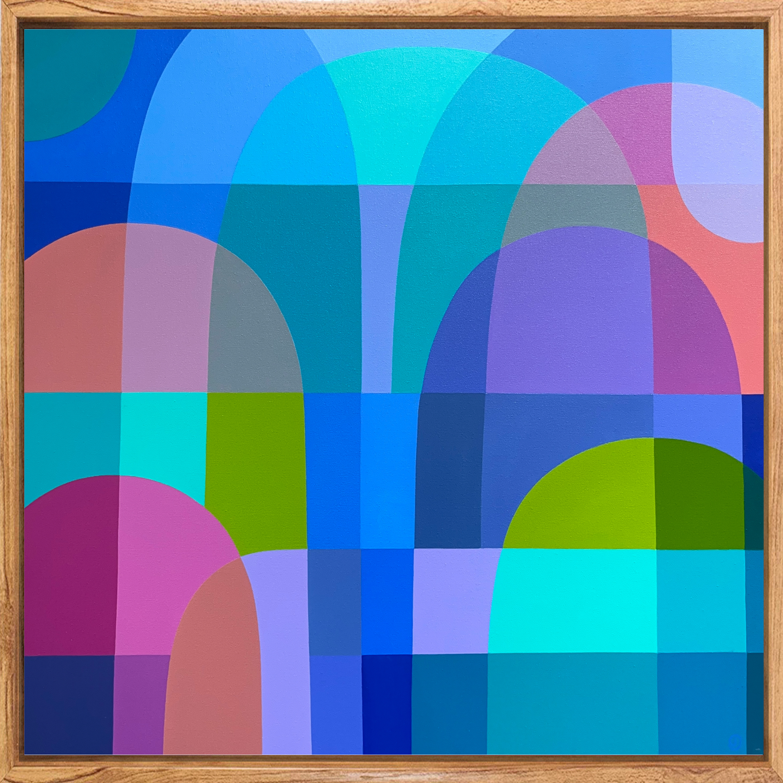 Seaside Melody is part of a series that’s inspired by hope for the future and embracing new opportunities and challenges. Created in Charlotte’s distinctive hard-edge style, this colourful painting draws on physical elements of a beach landscape (the sea, cliffs, horizon etc) to form an uplifting abstract composition. This work expresses Charlotte’s ongoing fascination with layering and juxtaposing vivid colour to play with opposing ideas of transparency and solidity, simplicity and complexity.