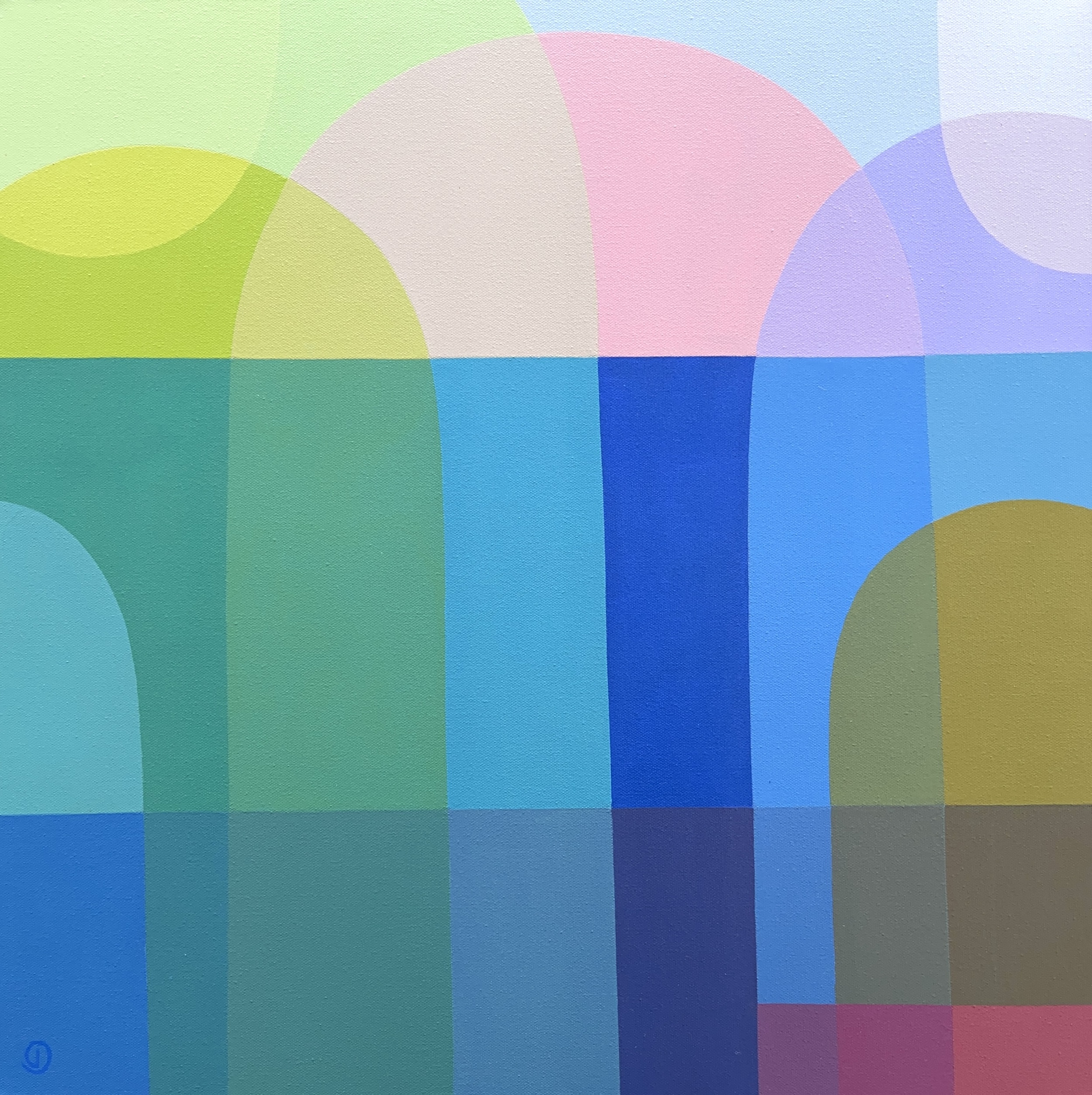 In this original painting, Charlotte is inspired by colour theory and the coastal landscapes of the Victorian Peninsula, interpreting forms from nature (rainbow arcs, rock formations, seaside horizons, rising tides etc) in her distinctive hard-edged style. This painting continues her fascination with layering and juxtaposing vivid colour, experimenting with ideas of transparency and solidity to evoke a sense of joy, light and equilibrium.