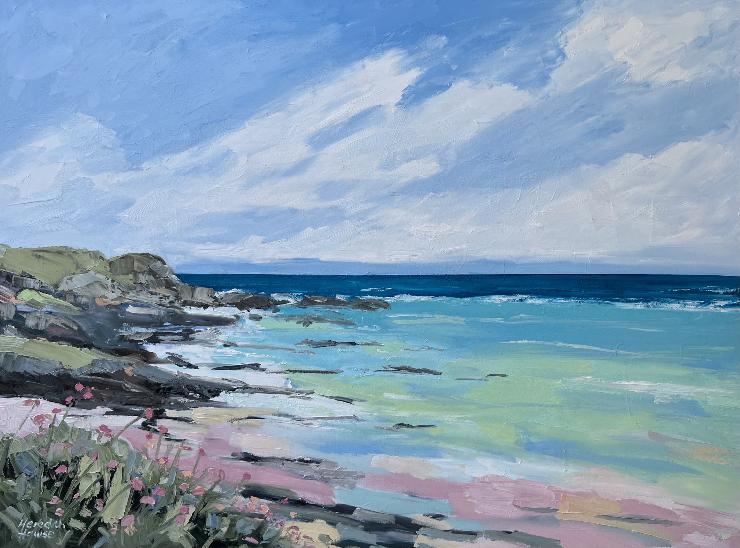 Seaside Serenity by Meredith Howse portrays a rocky headland jutting into the light turquoise waters of the ocean. The serene and tranquil atmosphere of the seaside setting is beautifully captured through the artist’s skilled use of colours and composition.