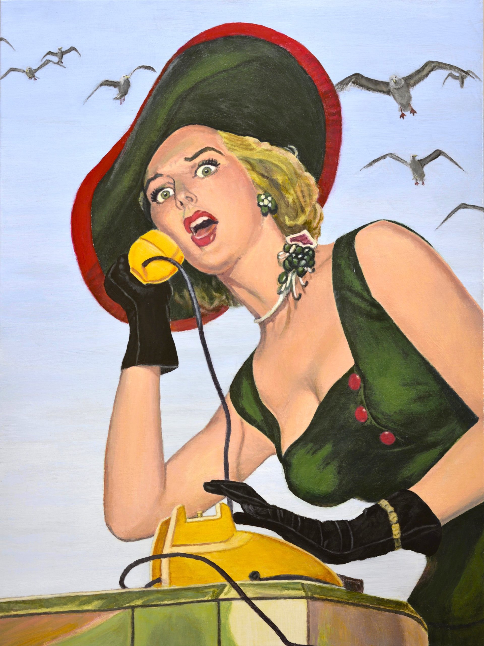 Seaside Terror is inspired by the pulp detective magazines that were popular from 1930s to the 1950s – Jane has created a surreal painting by appropriating a 1950s cover of a scared woman on a telephone and placing her against a background of threatening grey seagulls