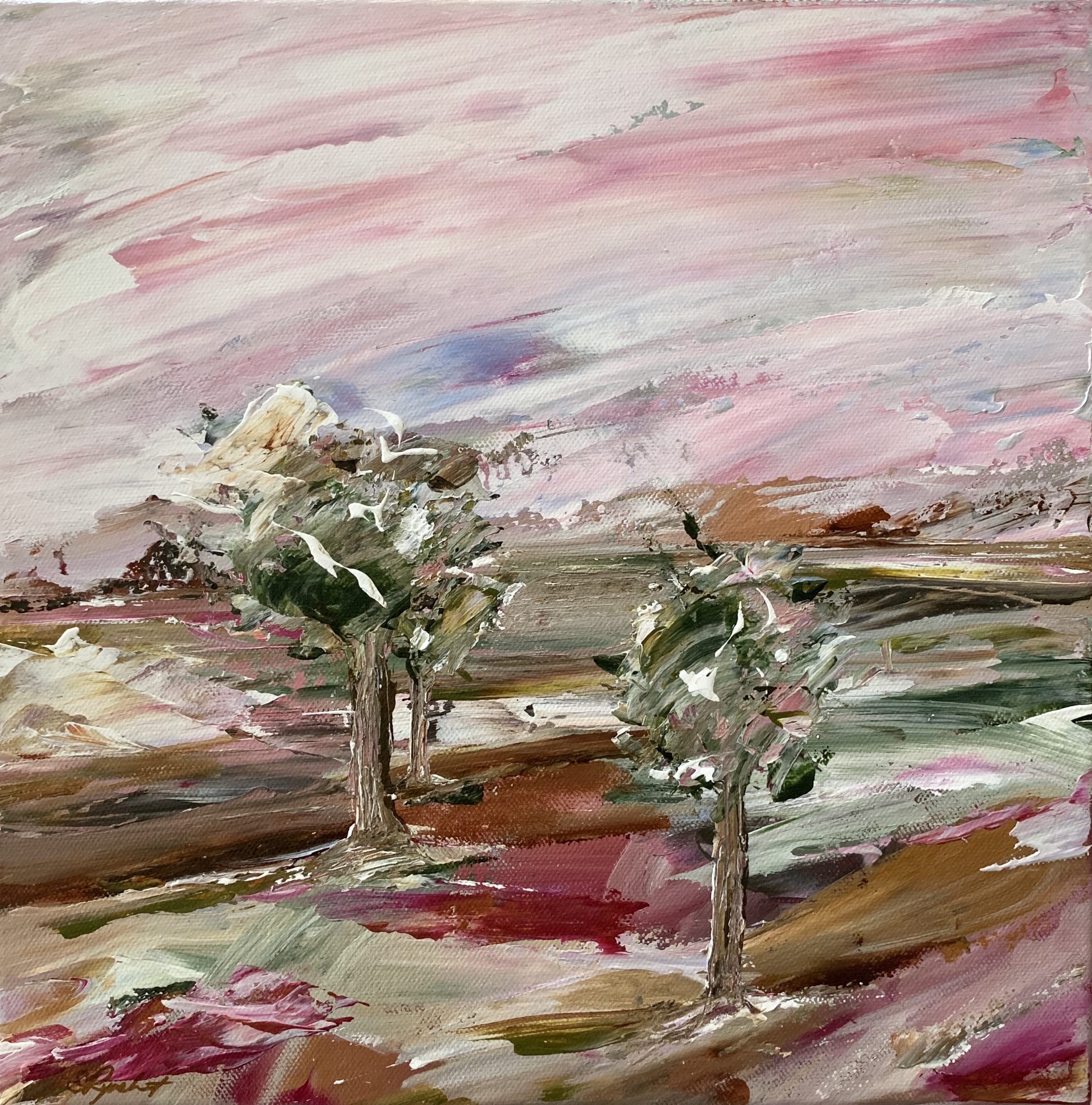 Stretched canvas with white painted sides, 30 x 30 x 2.5 cm, unframed, ready to hang.