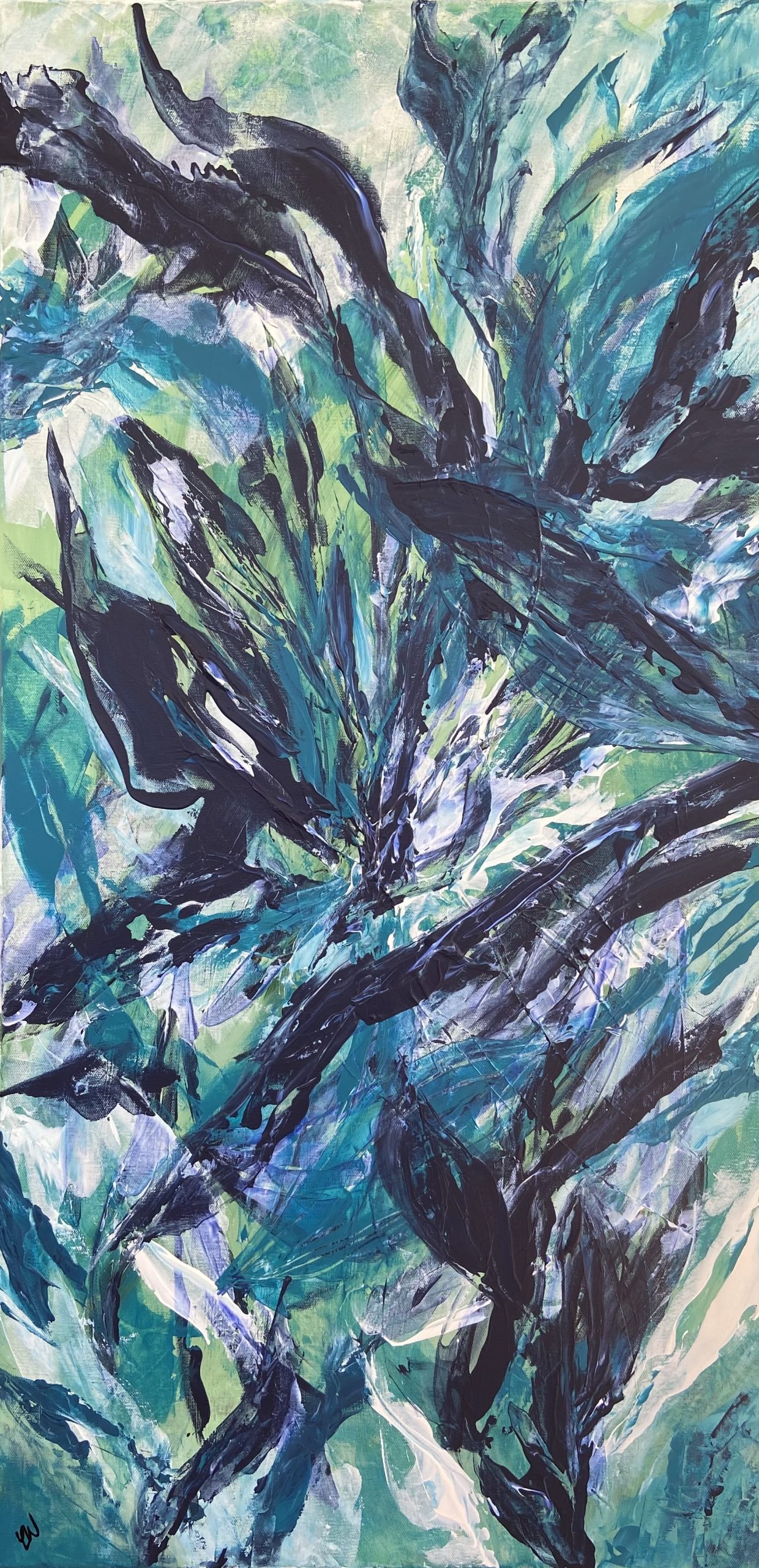 Secluded by Carrie Welsh is a beautifully textured abstract botanical painting. 101.6 x 50.8 cm. Acrylic on canvas, ready to hang. Frame in pictures not included.