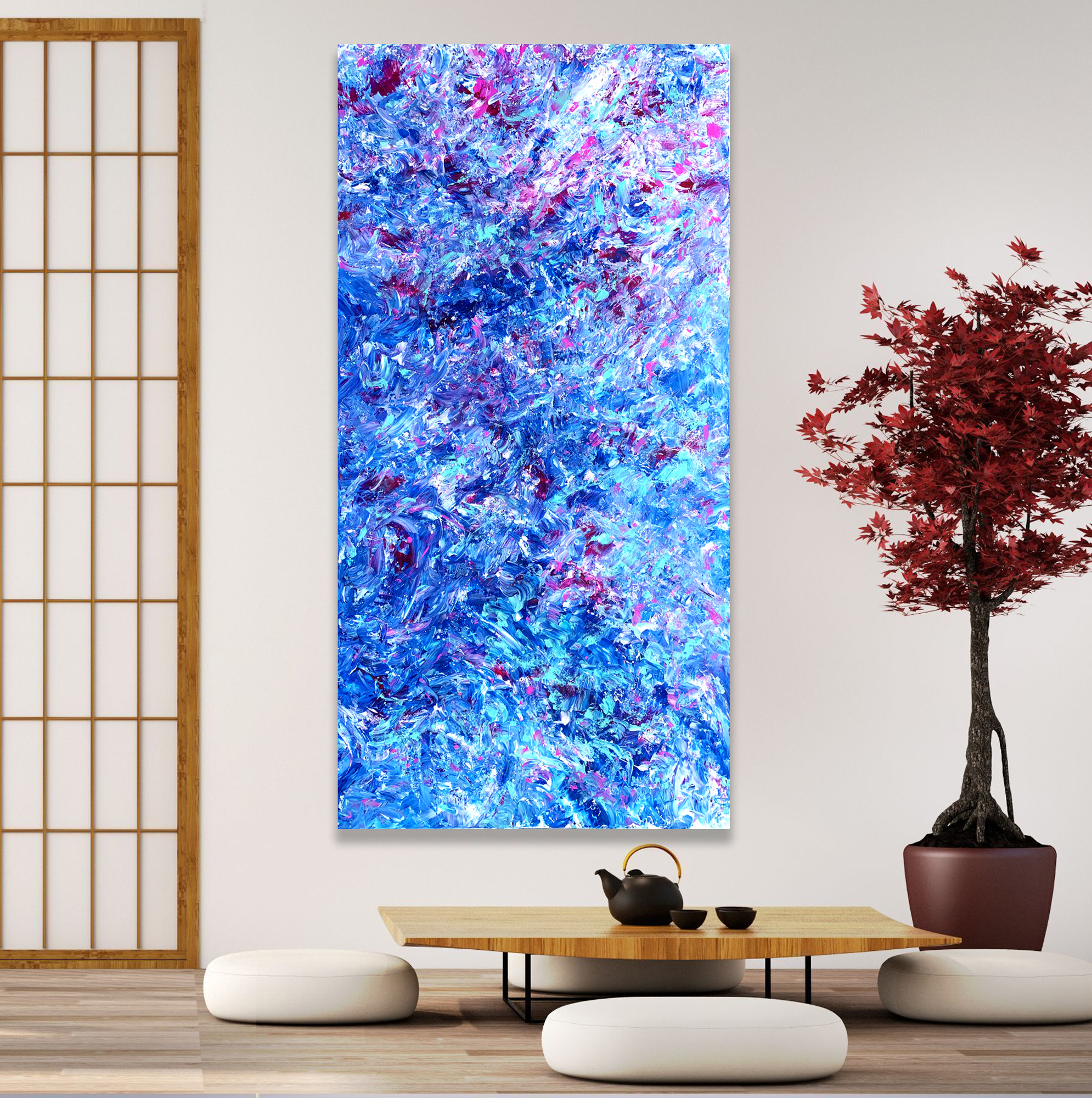 This work is painted on professional-grade canvas and has been sealed with varnish. This artwork on the Japanese Zen idea of ‘Simply Living.’ When one lives simply, one can find the beauty that would otherwise be hidden or secret. Emotionally, I am drawn to this idea and soI explored the idea here. This work is painted in the style of abstract expressionism. The canvas has the dimensions 91.4 cm width x 182.9 cm height. The work has sections that are impasto (thick paint), while the sides are painted white and so there is no need for a frame.