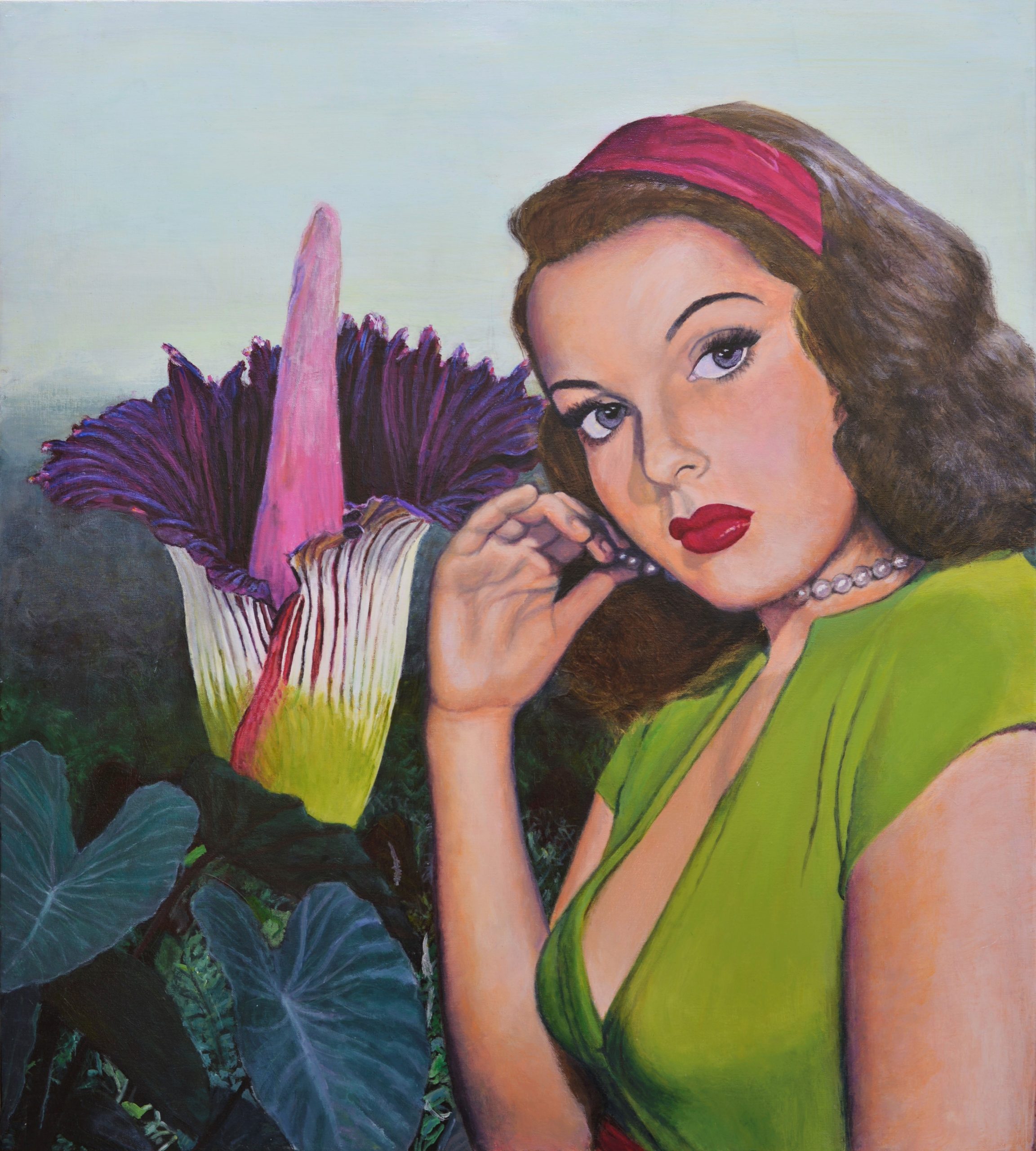 “Secret Desire” appropriates an image from a detective pulp magazine cover of the 1940s and places it in a misty setting with a huge stink lily in the background. The resulting painting has a surreal quality. This acrylic painting by Jane Ianniello measures 91cm x 122cm x 3.8cm. It is an original painting on a high quality Create Art stretched canvas with a sturdy pine frame. Ready to hang. Comes with a Certificate of Authenticity.