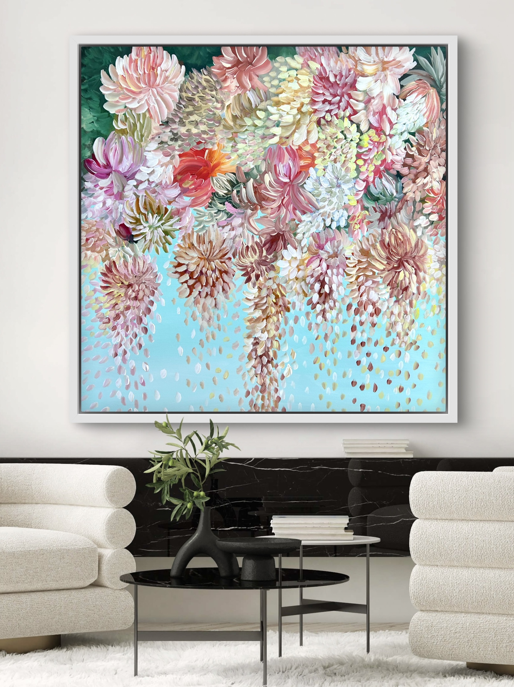 In creating this vibrant cascade of florals, I sought to capture the effervescent joy of a secret garden in bloom. Using acrylics, I layered brushstrokes to blend the vivid energy of expressionism with the delicate nuance of impressionism. This painting invites onlookers into a serene, yet jubilant space, offering a breath of fresh air and a burst of inspiration to any room. The painting does not come with an external frame .The painting is signed and dated at the back and comes with a certificate of Authenticity.