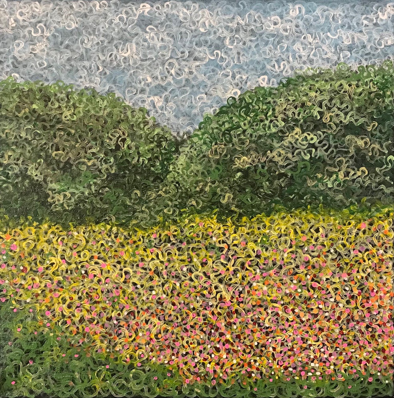 My secret garden created using my swirl brush strokes. The trees in the background, with the grass in the foreground with the beautiful colour flowers blooming throughout.