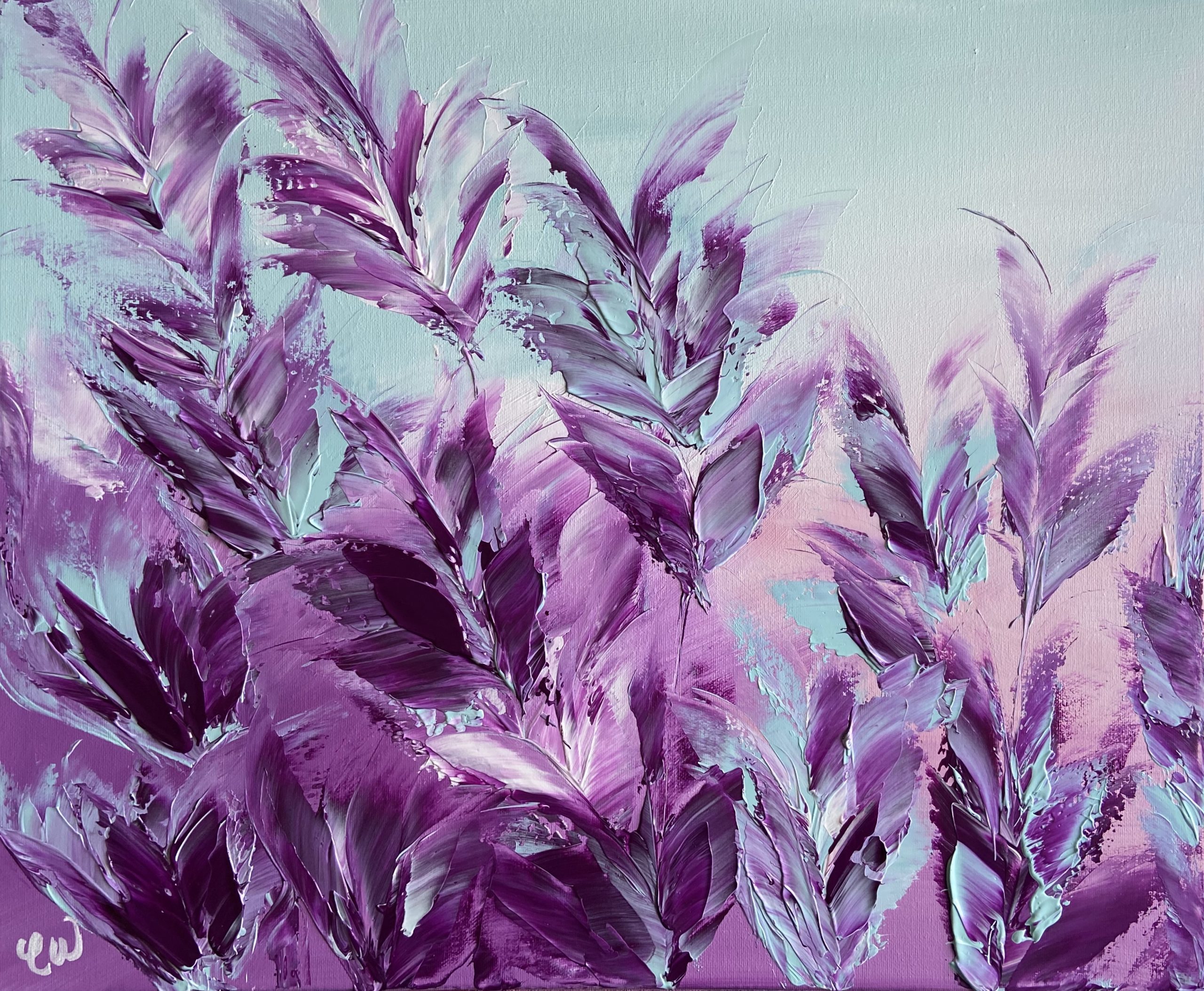 Secret Garden by Carrie Welsh is a beautifully textured abstract botanical piece. A stunning colour combination has been used which makes this painting very pretty and will brighten any space. 50 x 60 cm. Acrylic on canvas, ready to hang.