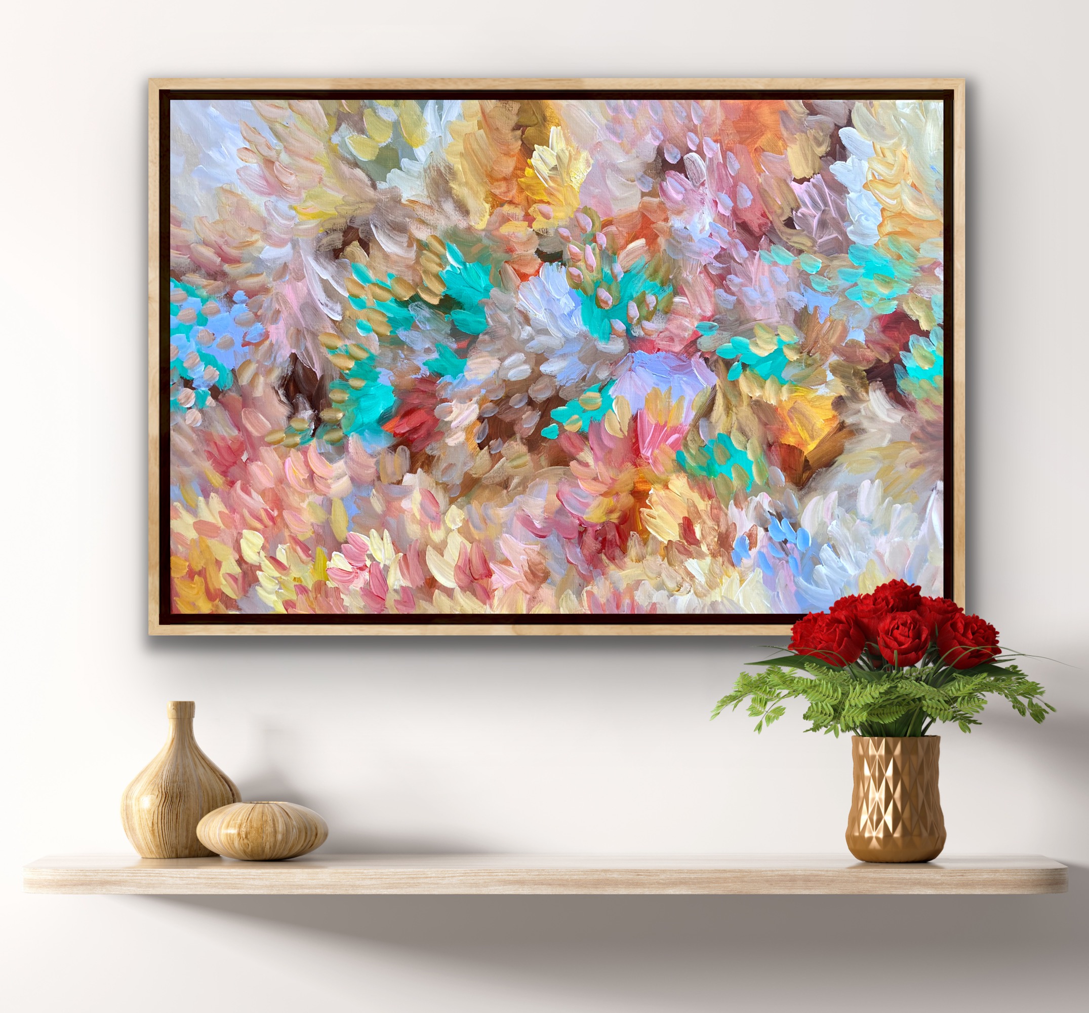 Secret Pleasures a painting with lots of layers of beautiful colours of petals covering the fields. The landscape becomes a bouquet of petals dancing over the land. I tried to create this beautiful composition of colours of the landscape of flowers and petals making a beautiful field of colours. Capturing the beautiful colours of the petals, foliage of the trees like musical notes dancing over the landscape . The field comes to life with the sounds of the petals creating movement and rhythms. The painting does not come with an external frame.The painting is signed and dated 2022 at the back and comes with a certificate of Authenticity.