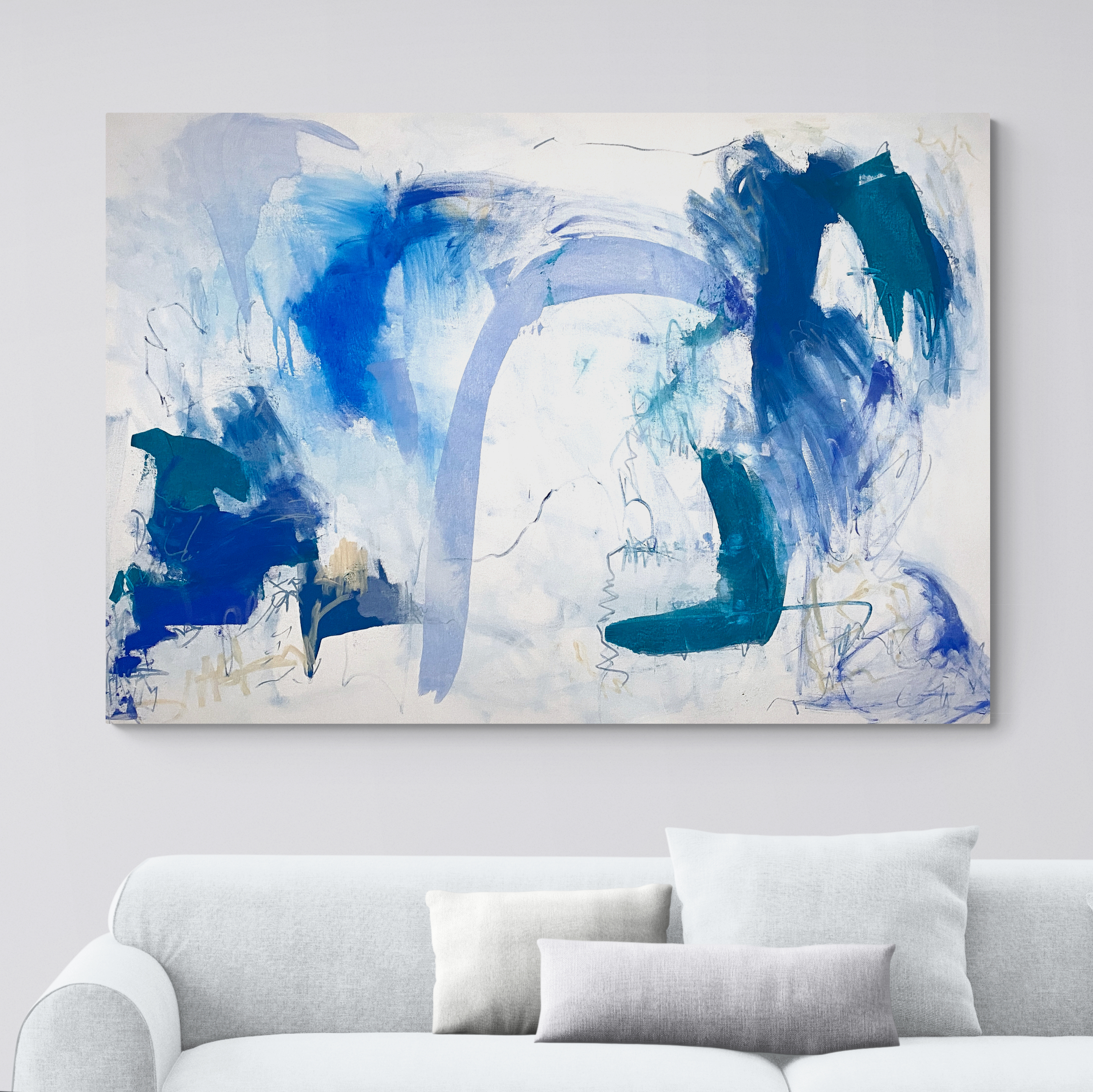 Secret Spot is an original artwork perfect for any large space. Its vibrant palette of deep blues and teal combined with a hint of peach makes the bold expressionist mark-making come alive.