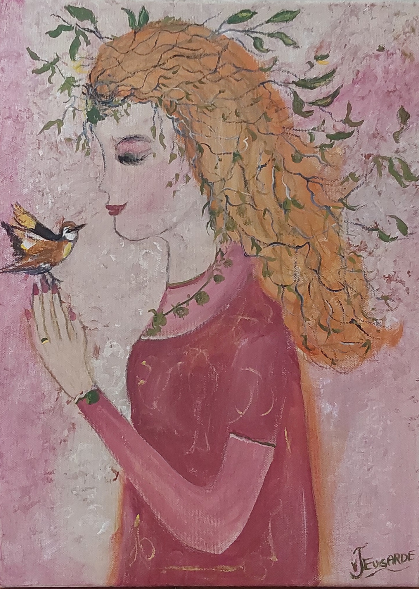 This is another of my babe and the bird series, this woodland girl has been given the secrets of the forest by her feathered friend. They protect each other with kindness and caring for the forest and all creatures great or small. This acrylic painting has the background pattern continued around the sides and it is sealed with asatin varnish.