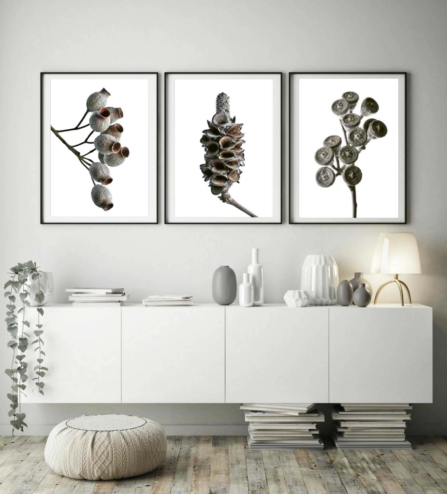 Australian native botanical set of 3. Eucalyptus, Banksia Pod and Gum Nuts still life prints. Simple, minimalist and uniquely Australian.