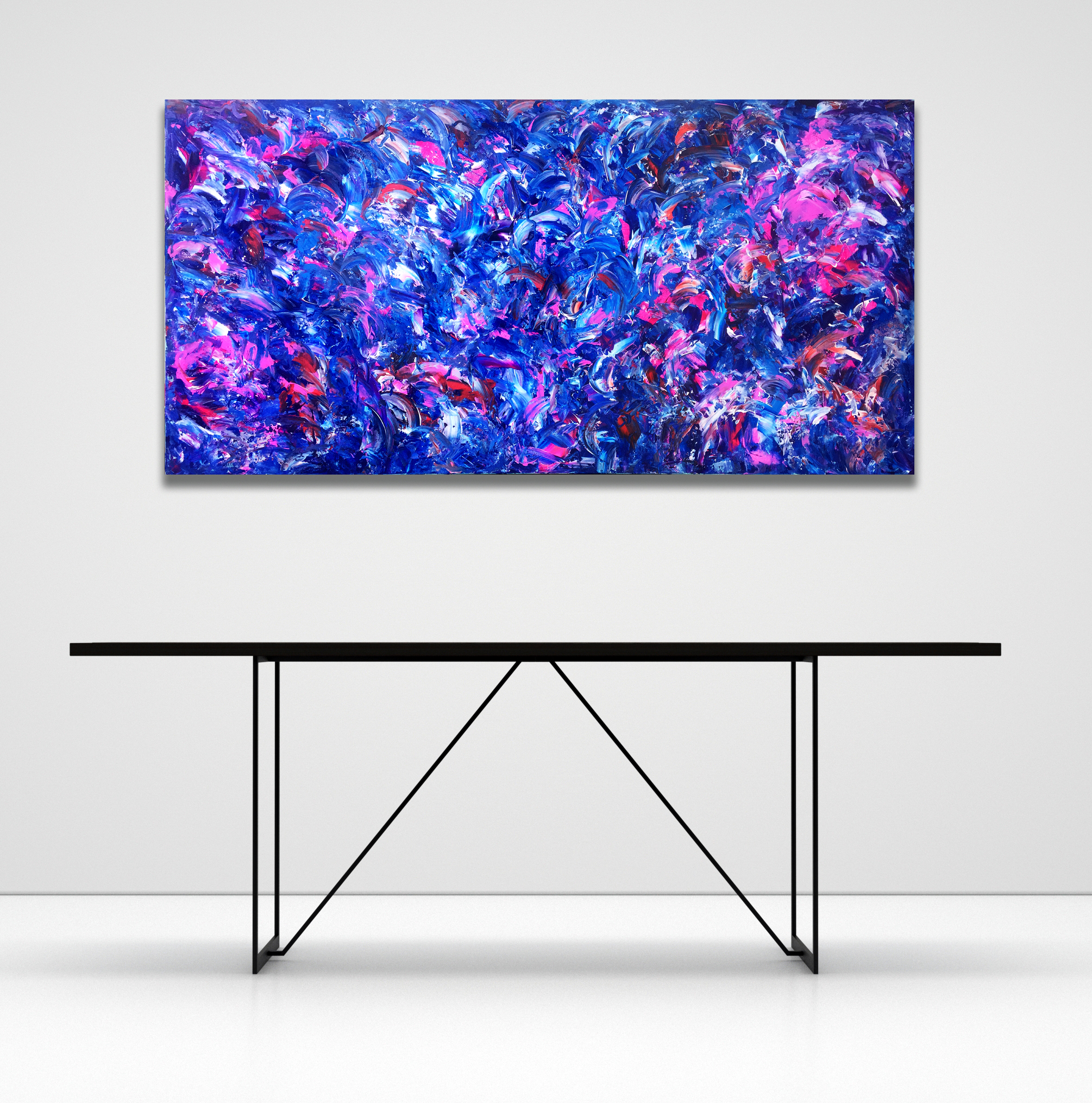 Seething Occultation by Estelle Asmodelle – This work concerns what is hidden by something else; Occultation. Just like a planet can move over its moon, occultating the moon. So too can emotional hide other emotions. This painting explores one emotion hidden by another more powerful. Is that original emotion still there and if so can it be felt? Painted in the style of abstract expressionism. The canvas is 152.4 cm (W) x 76.2 cm (H). The sides are painted white so no frame is required. The painting was created with Synthetic Polymer on a professional stretcher.
