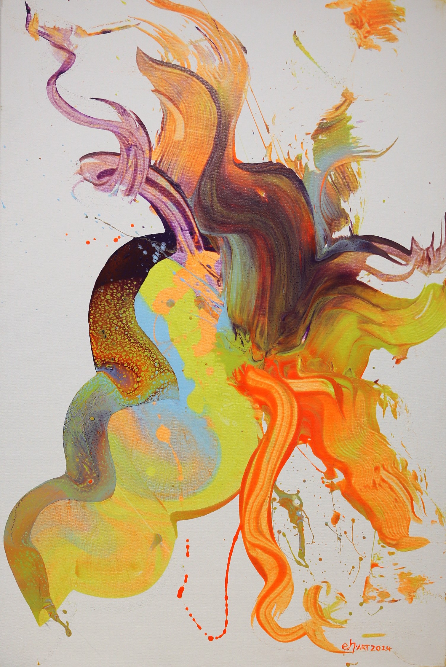 The striking colours chosen for this work were the motivating factor. Spending hours mixing hues and intensities, these colours were a standout and begged to be placed together in synthesis. Trialling just the right amount of medium to create the most appropriate flow for the paint to be smeared and swirled, emphasizing one colour and then the next. Working on this canvas from all sides and finally deciding on the current orientation.