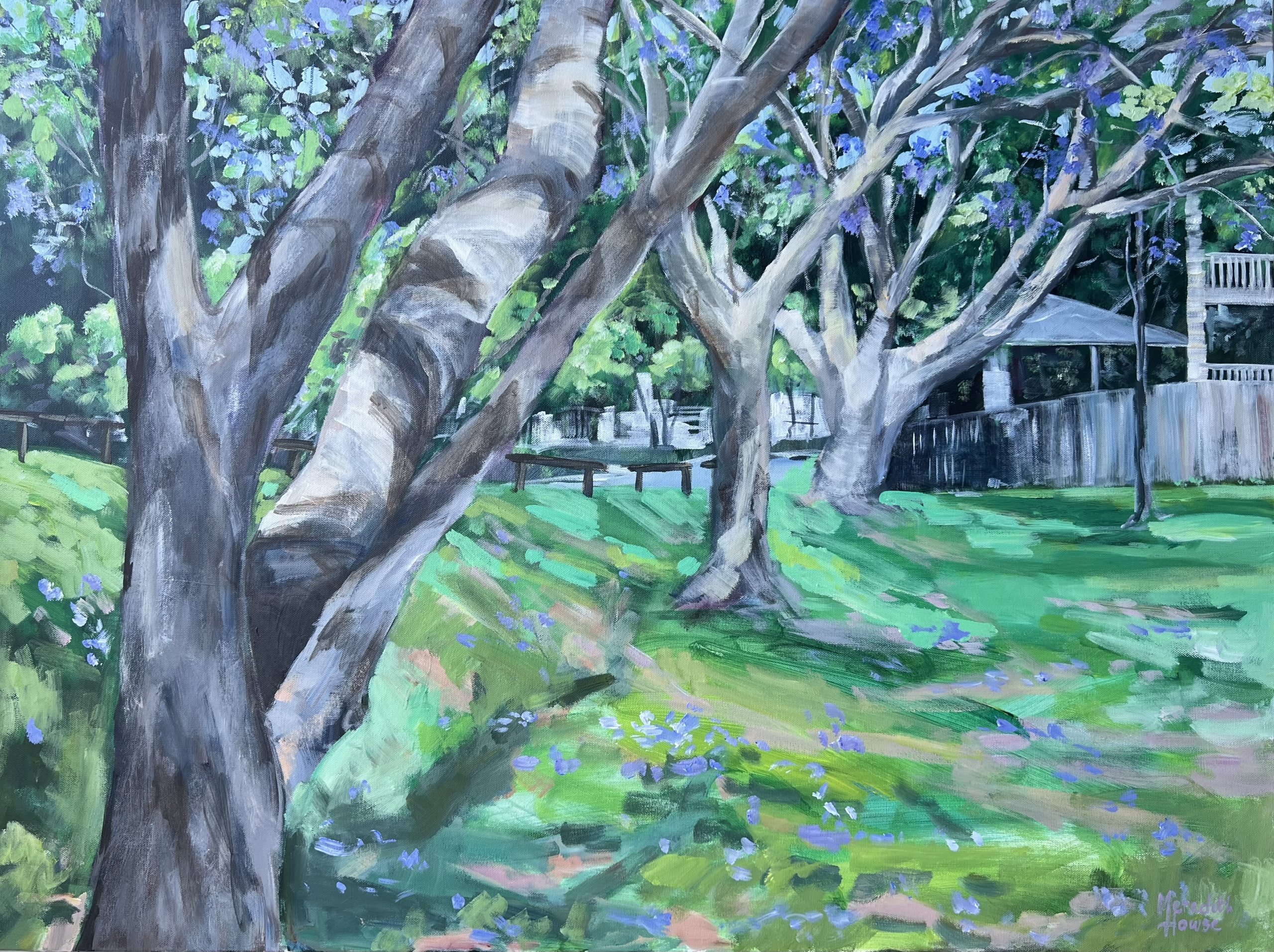Seils Park Ashgrove by Meredith Howse captures a lush, leafy pathway in Brisbane’s Ashgrove neighbourhood. Painted in Meredith Howse’s signature style, this piece is vibrant with energy and colour.