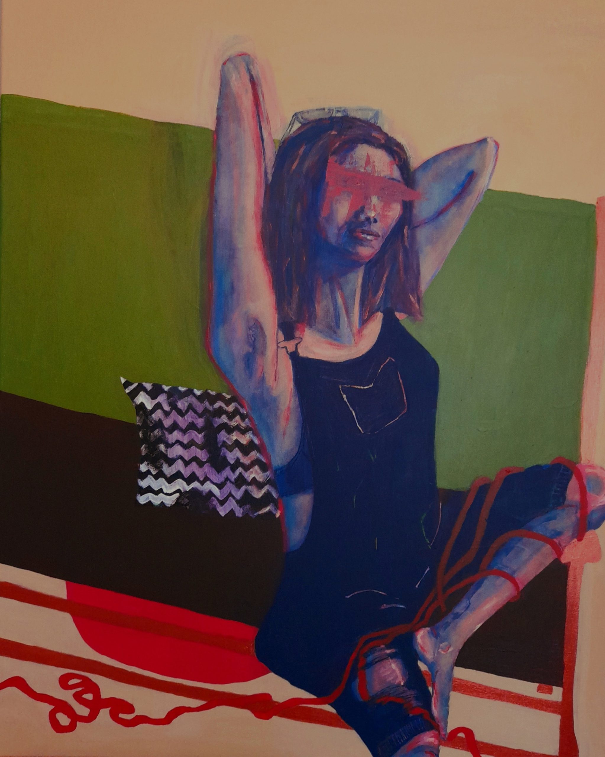 It’s a masked version of oneself, trying to be more youthful or less ‘something else’. This has been carefully curated like other parts of ourselves that we present in new situations, curated to keep the unpalatable aspects of life out of view (signified here by the rope).