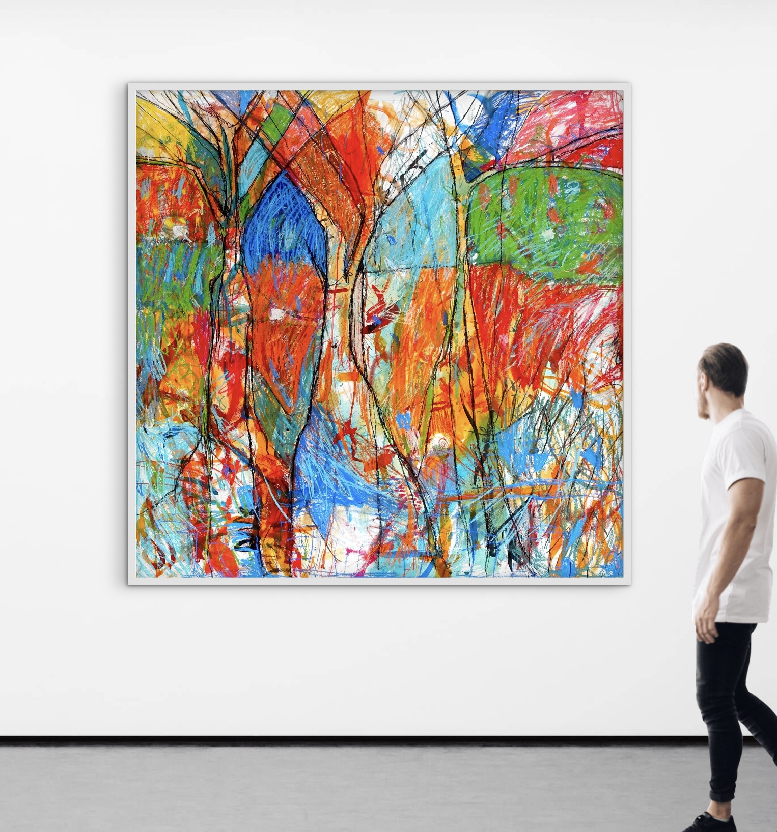 This work is 120cm X 120cm from edge to edge. it is signed on the front and sent with a certificate of authenticity. It is sent unframed in a roll in a sturdy tube, wrapped in glassine paper and will need to be framed to hang. I recommend matching the frame around the work to your home rather than to the painting ie if you have a lot of timber use a timber frame. But I have given images with different frames for you to see.