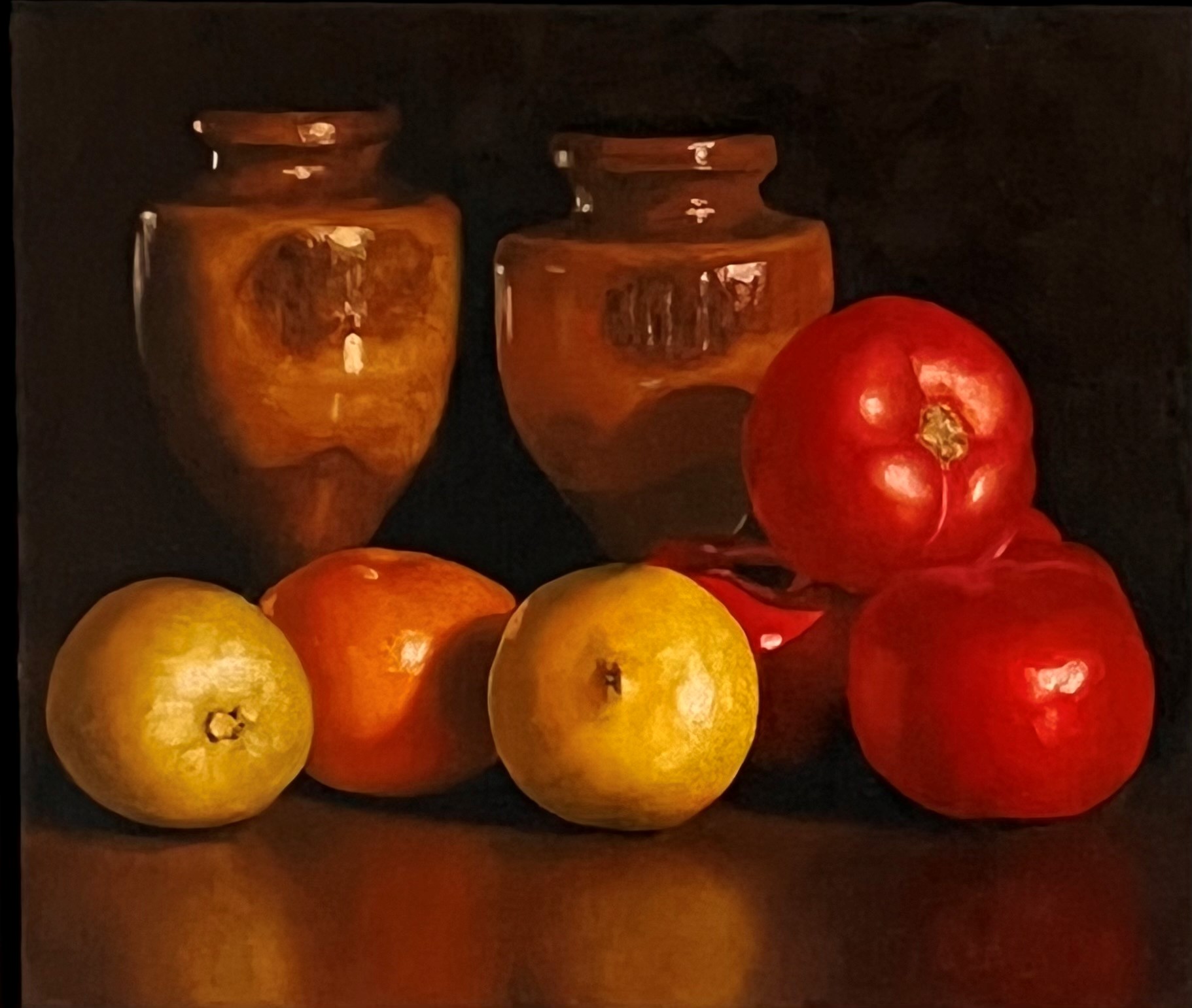 Whilst figurative painting is my first love, I also paint still life and I relish the effect of light on form. This tableau is painted from life in my light filled studio where the strong Australian light creates beautiful vignettes. It’s made even more special with the addition of two wooden urns which were my parents’ and were such a constant in my life growing up on the farm. Those two little urns were always in the background witnessing the chaotic life of a big loving family – the unconditional love, the laughter, the fighting, the joy, the sadness and ultimately the grief.