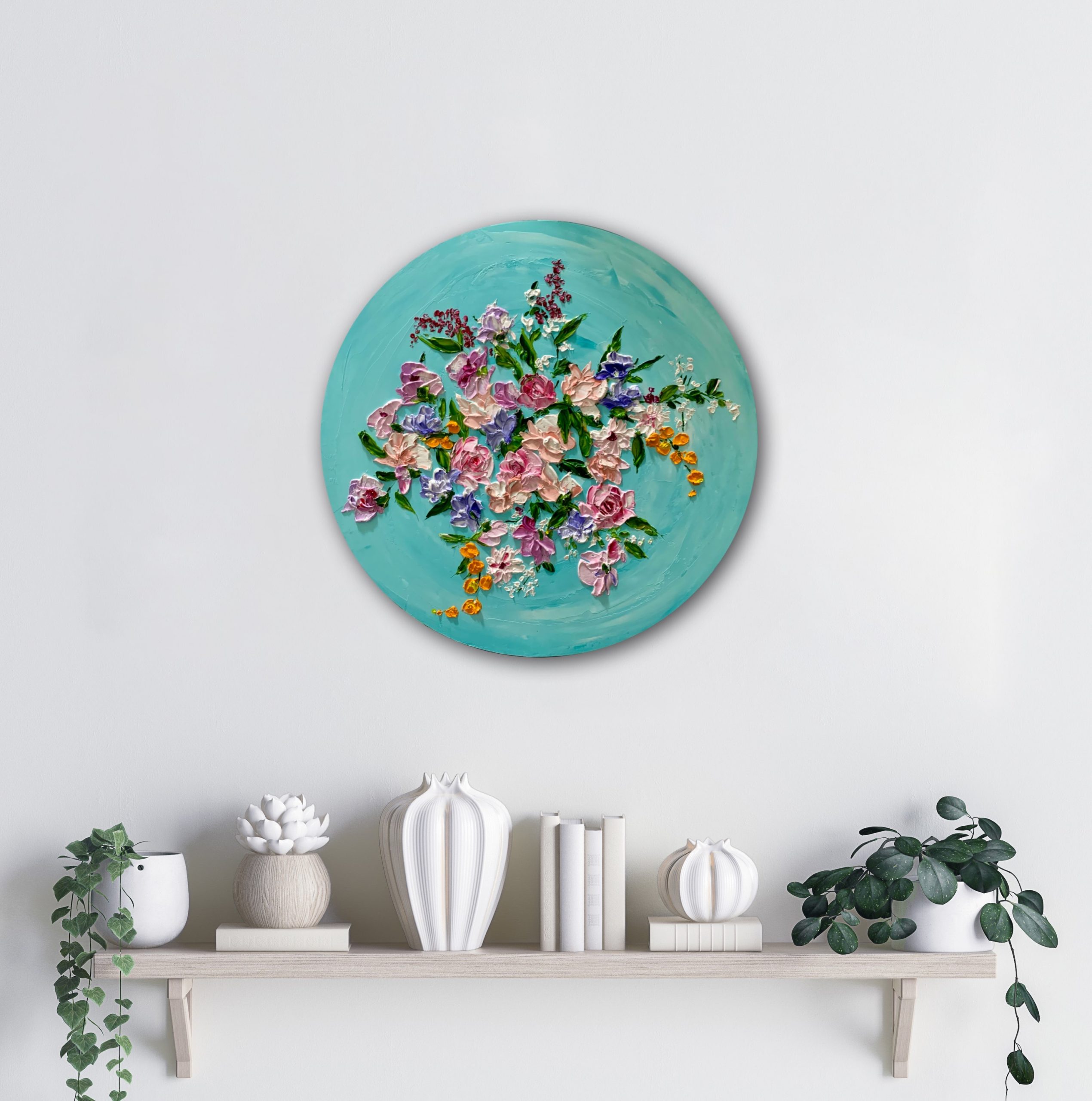 This artwork is made using impasto technique with palette knife on circular wooden panel, with wire across to hang.