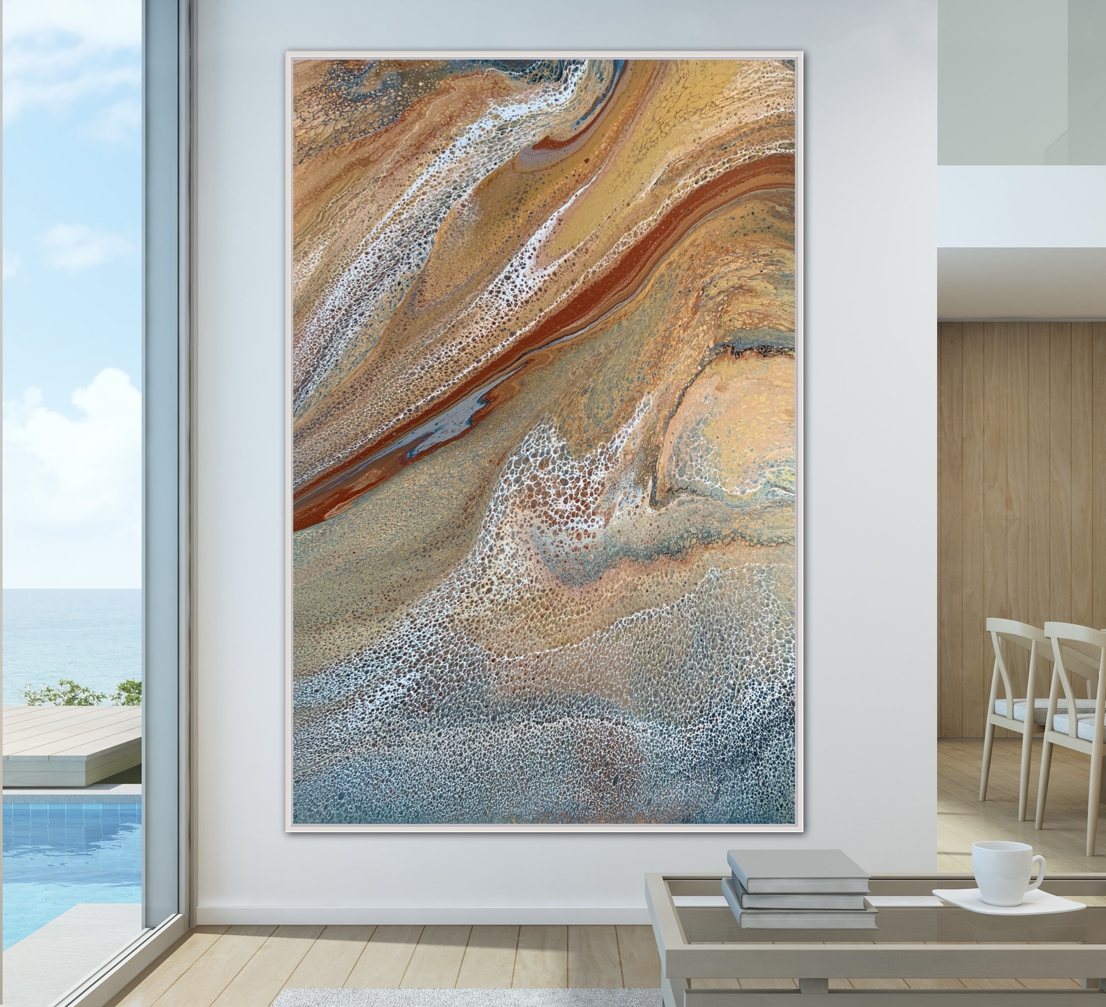 Serene Shores – original artwork by Angela Roskell – a unique, eye-catching multi-directional large abstract acrylic painting stretched and ready to hang.