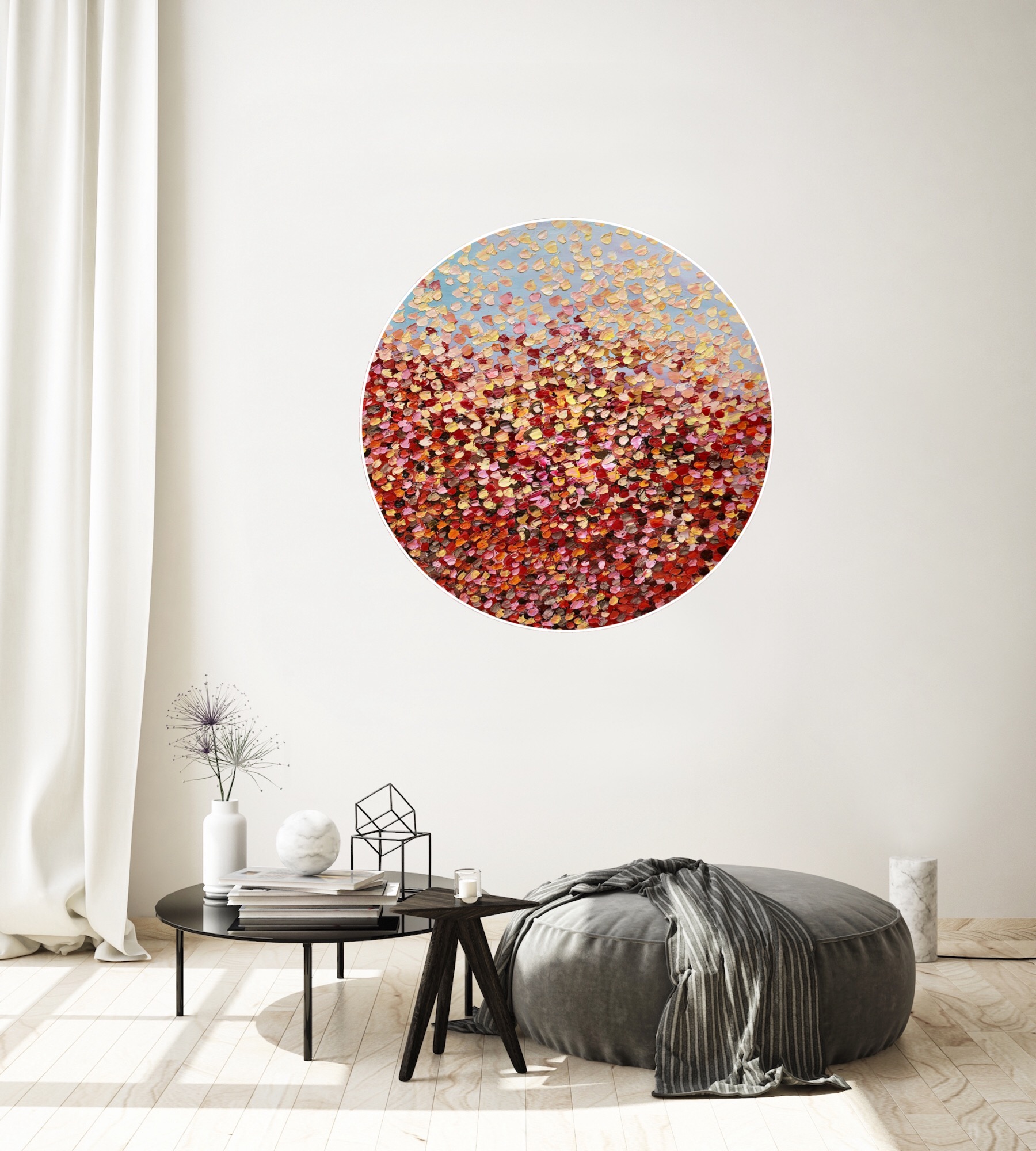 Serenity is a very textured painting with so much depth by creating lots of layers of paint giving it a three dimensional feel . The painting is stretched on round frame and ready to hang. Petals falling from the sky falling onto the landscape, creating a beautiful bed of petals .This painting is painted with a pallet knife with thick oil paints on canvas. Hope this painting makes the viewer feel peaceful and tranquil.The painting is signed and dated 2020 at the back and comes with a certificate of Authenticity.