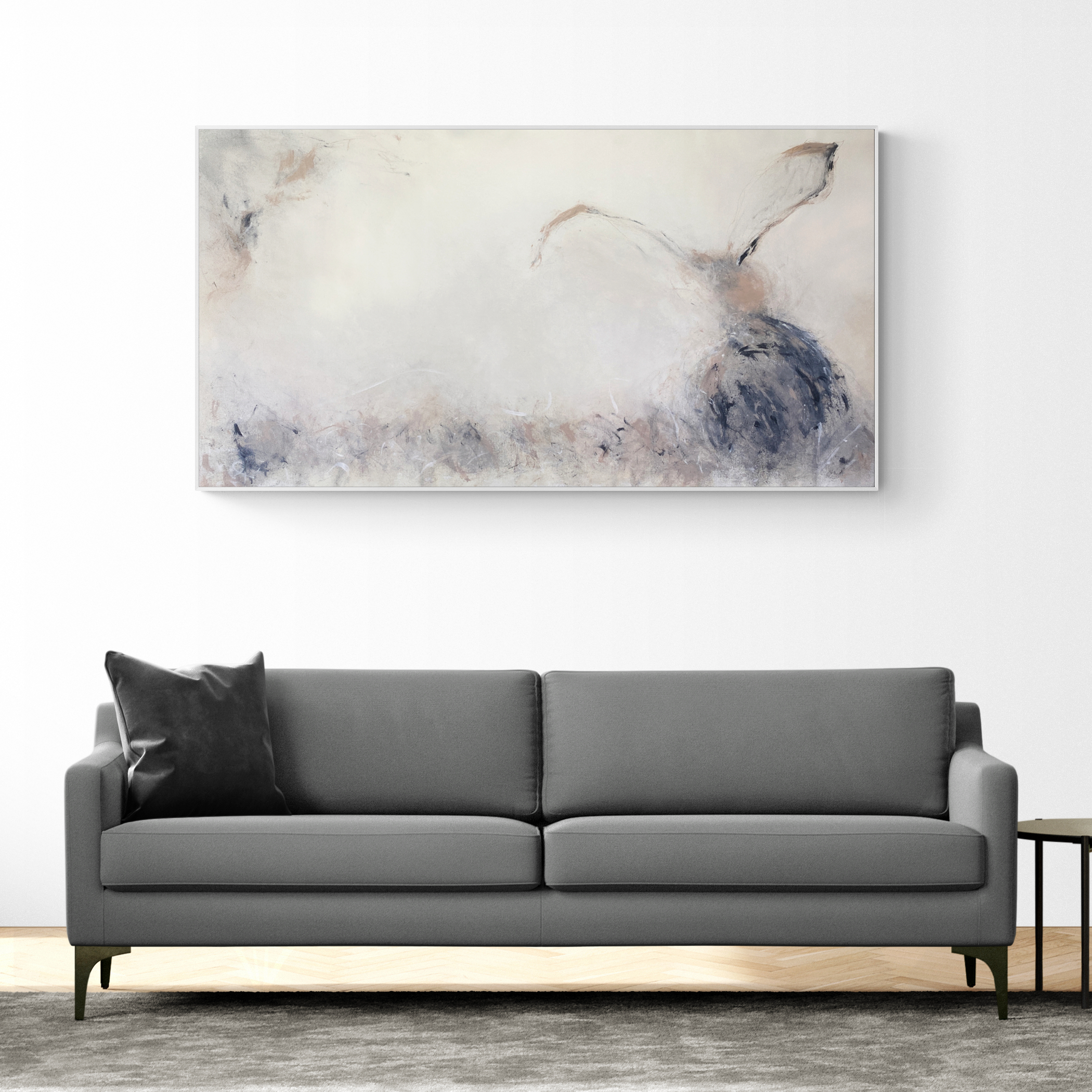 The mark-making speaks of the tension in the landscape and the subtle palette suggests the movement of things coming into and fading out of view, whilst the silence of the gentle scumbling punctuates the spaces in-between. It is the largest piece from my current series ‘Silence, Tension, Space’.