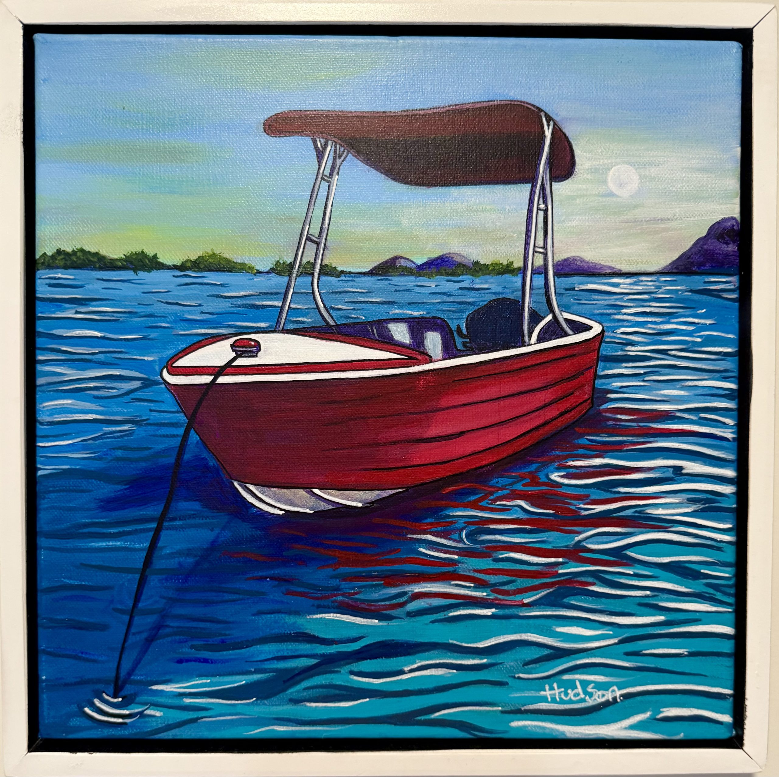 This is an original acrylic painting on canvas, custom framed in a white timber floating frame ready to hang.