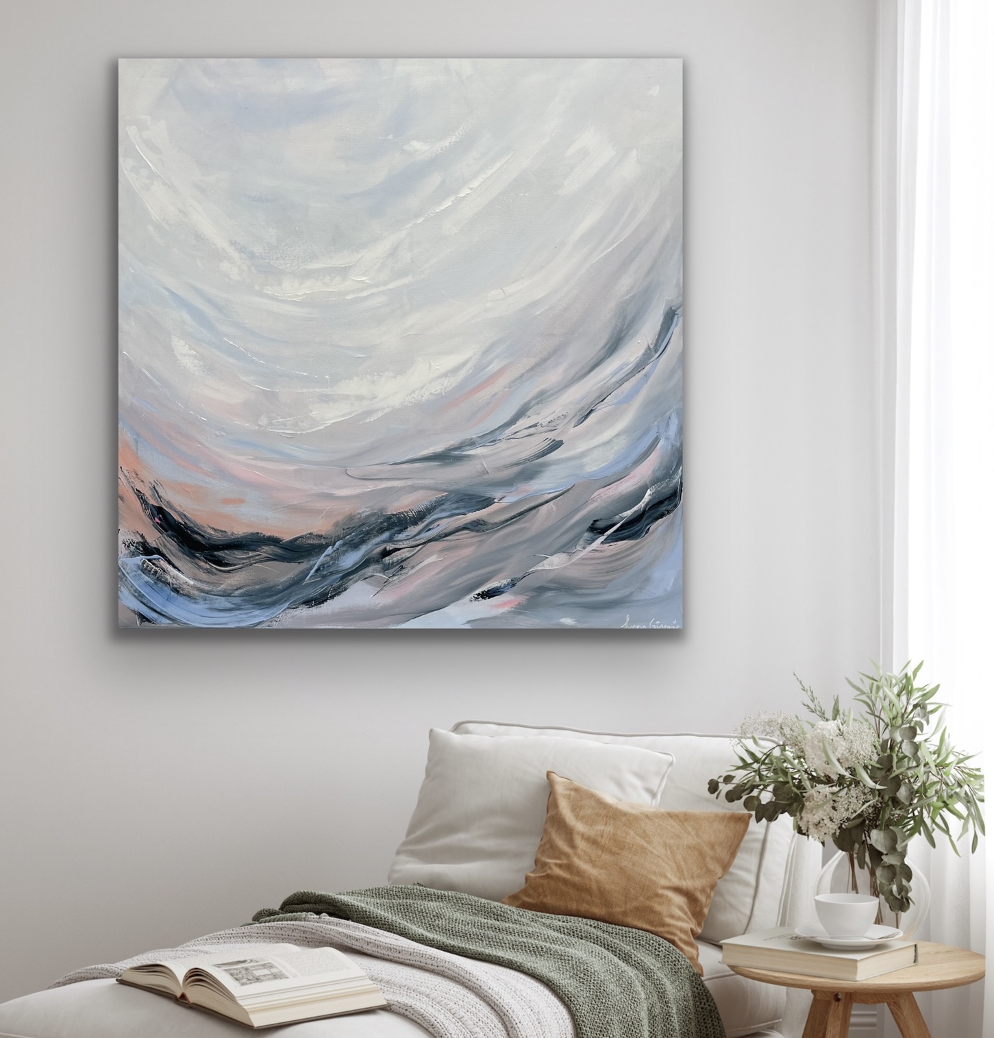 An ethereal world comes to life through a delicate interplay of colours. These rich, midnight blues are woven with intricate strokes that seem to dance like waves. Delicate hints of dusty, calming light pink tones add gentle accents and a touch of warmth and femininity to the painting create a serene and calm feel.
