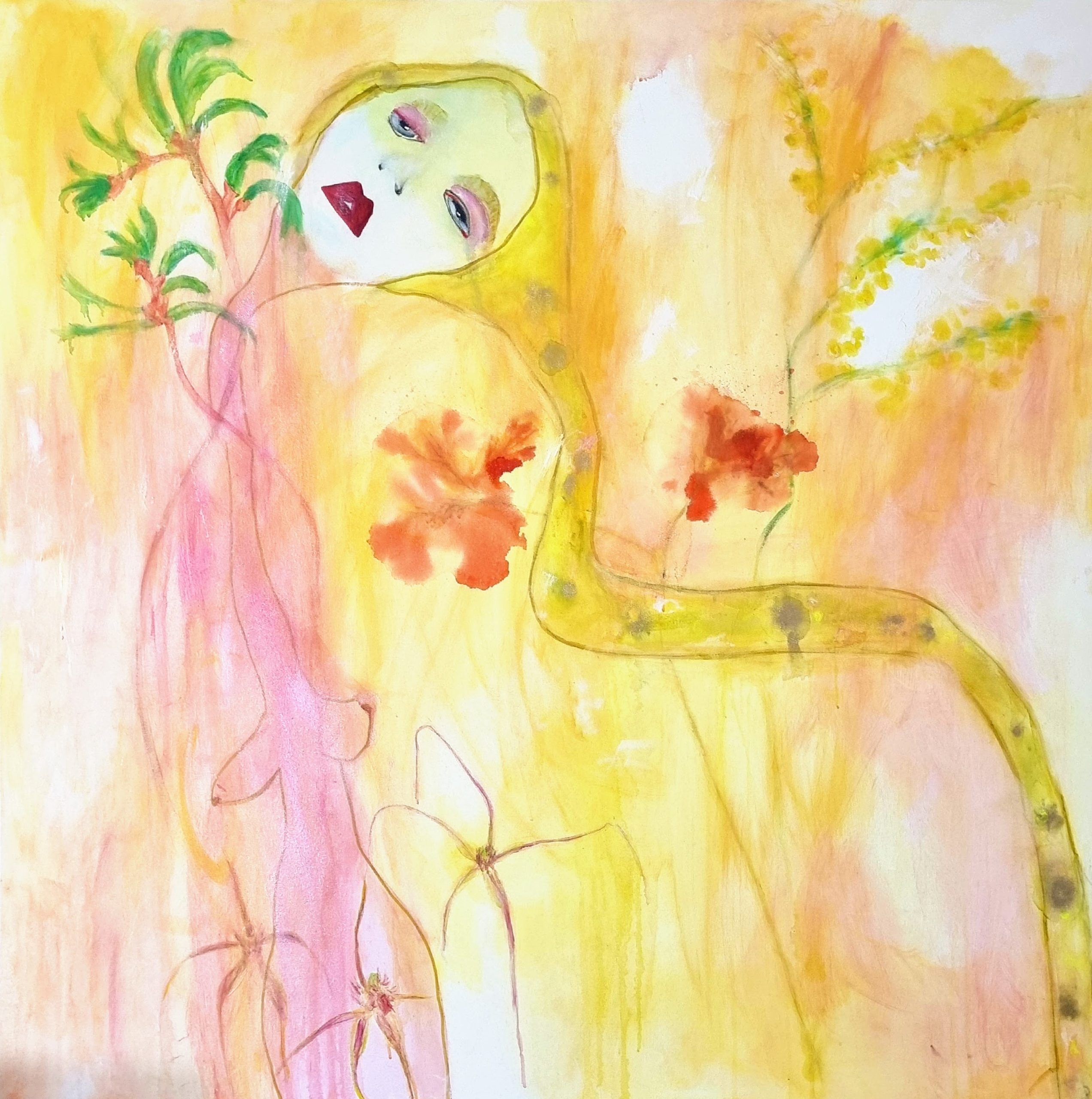 Serpentis is transformed, her hair a river of snakeskin, naked as if the very skin like the snake has been renewed. Surrounded by the Flowering Xmas tree- her companion, spider orchids and Acacia flowers symbolizing birth and rebirth.