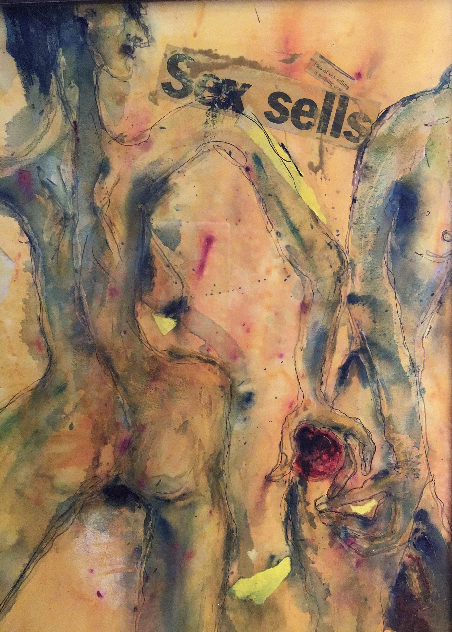 This work was created specifically for a R-rated group exhibition at a commercial art gallery in St.Kilda, Victoria. I had fun doing it, based on the biblical story of Eve offering the forbidden apple to Adam (who is rather scrawny..). While another equally naughty work was sold at the exhibition this one remained. The bits of newspaper collages are from the local newspaper publications on the controversy of the first brothel being built in the town where I lived at the time.