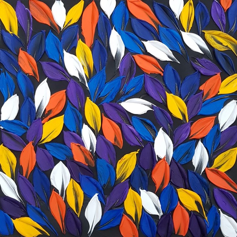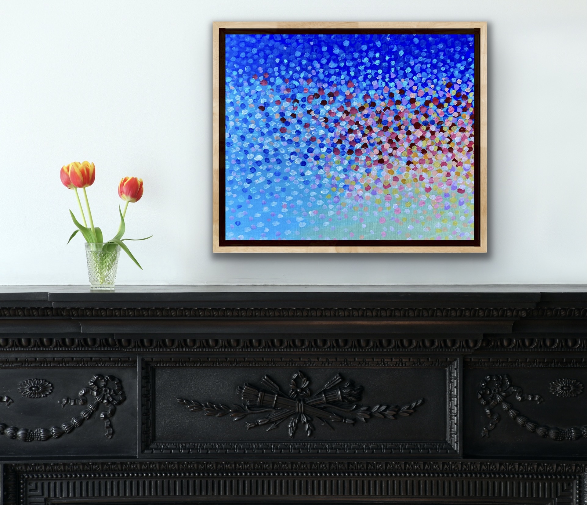 Shades of Blue by Theo Papathomas a very soothing and tranquil painting with so much depth. I wanted to have a lot of space to bring out all the beautiful colours of the blue sky and sea. I tried to create this beautiful composition of blue mix with petals . Capturing the beautiful colours of the petals, dancing against the sky creating a small rainbow of petals. A very harmonious and tranquil composition that can be enjoyed many years to come. The painting is signed and dated 2020 at the back and comes with a certificate of Authenticity.