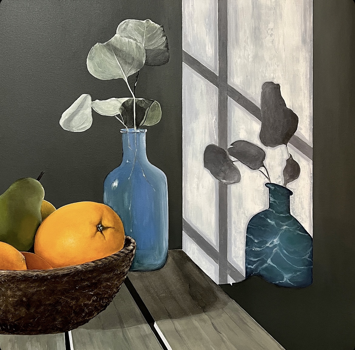 Shades of Blue by Kate Harkin – A still life of a blue glass bottle and fruit bowl atop a timber table, with reflections and shadows on the adjacent wall. This piece is a study of light and shadow and the beauty of reflections seen in day to day items