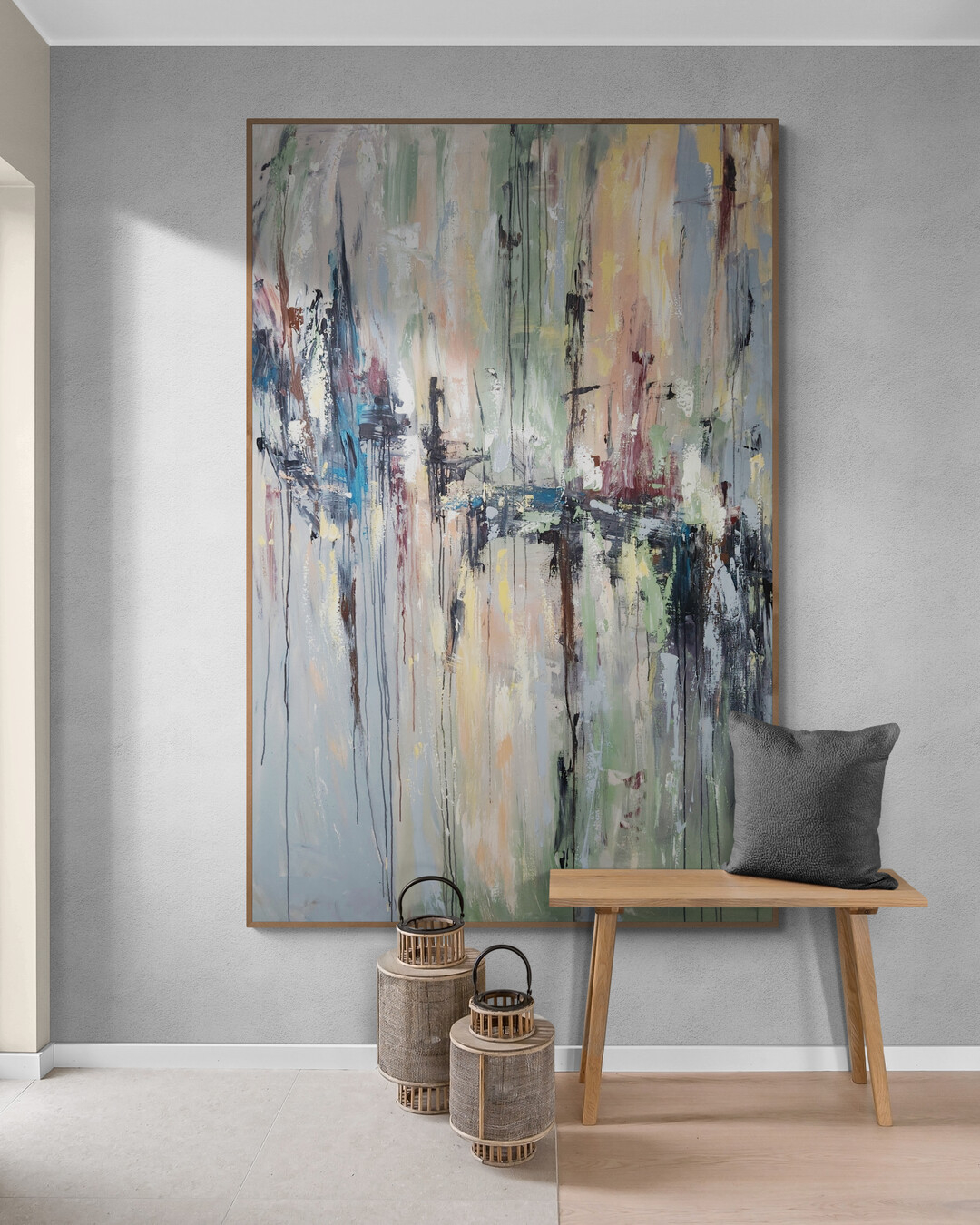 This beautiful modern piece is made with lots of layers of texture and drips of acrylic paint. It was sprayed with varnish for a protection of colour.