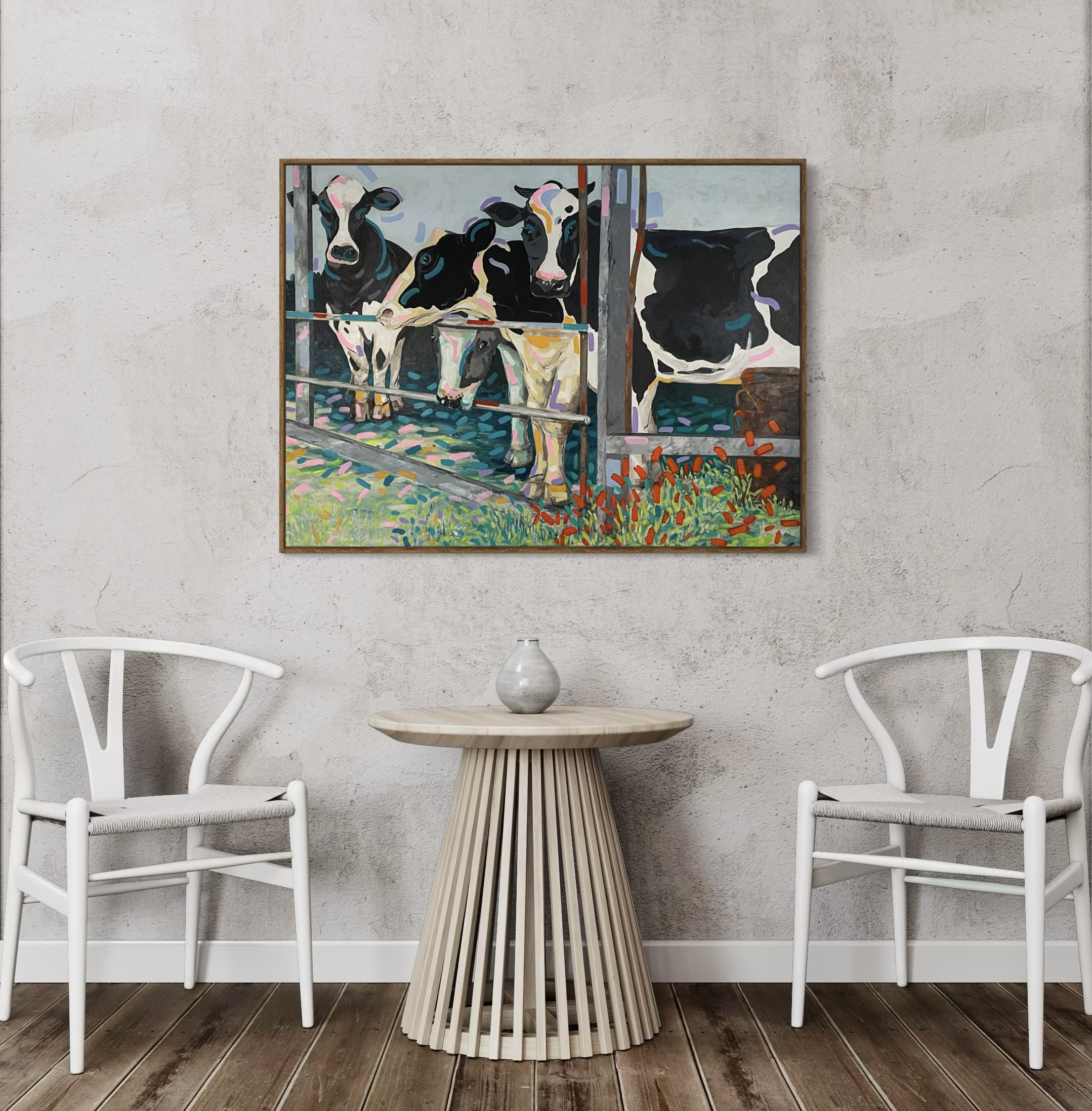 Cows gather near a fence in a vibrant mix of colour, capturing the essence of rural life. Dabs of bright acrylic colours highlight this joyous farming moment.