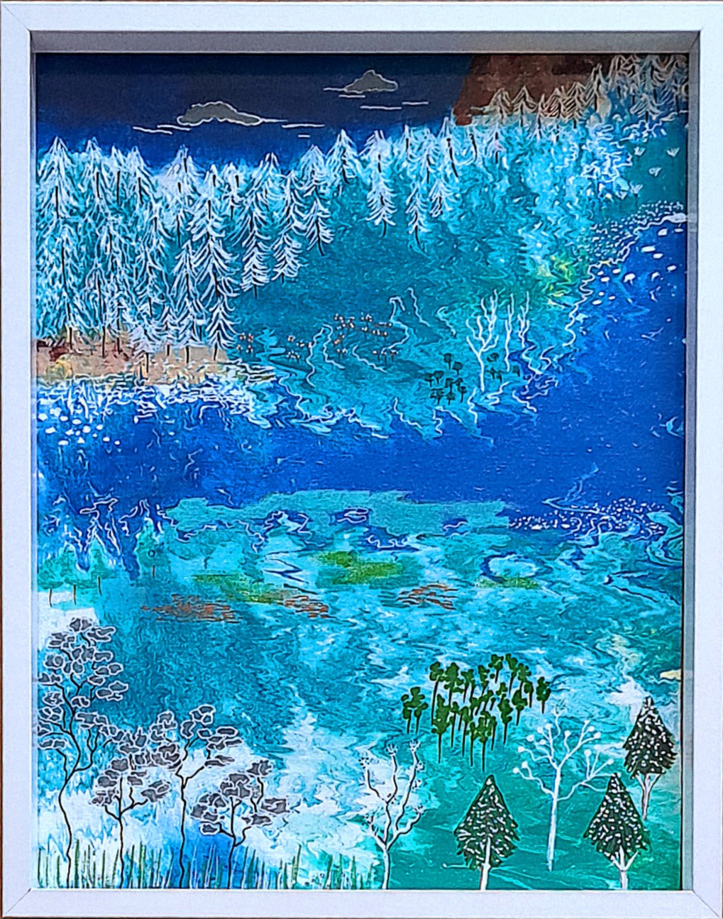 Shades of Winter – Collaborative Artwork by Mikki Campbell and Richard Paulger. Paint pouring base by R L Paulger Artworks, design and Artwork over paint pour Mikki Campbell Art.