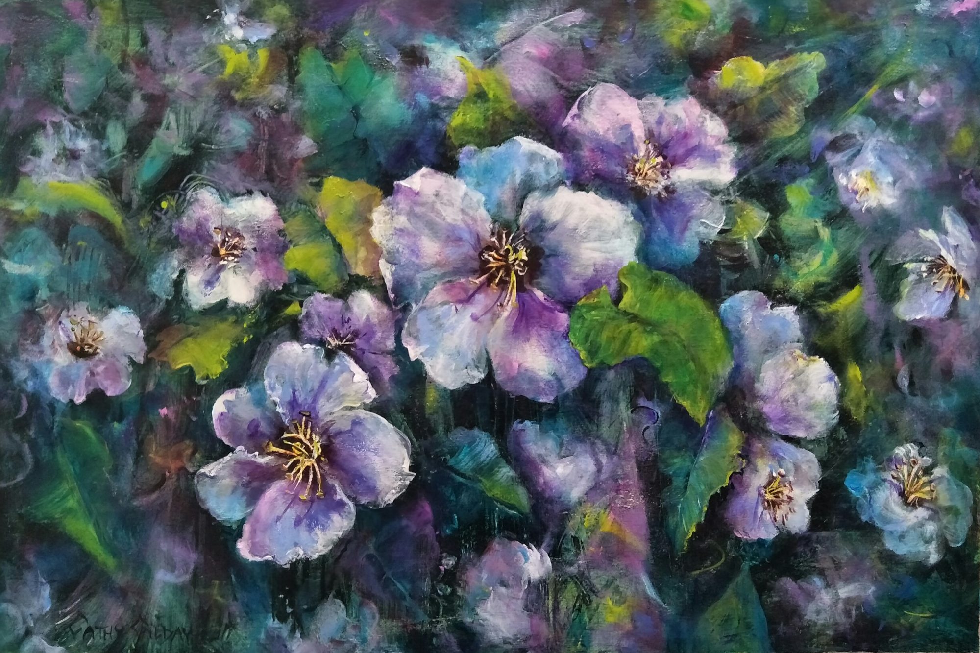 Shadow Dance by Cathy Gilday – A colourful floral painting with a whimsical feel, bring the outdoors in.