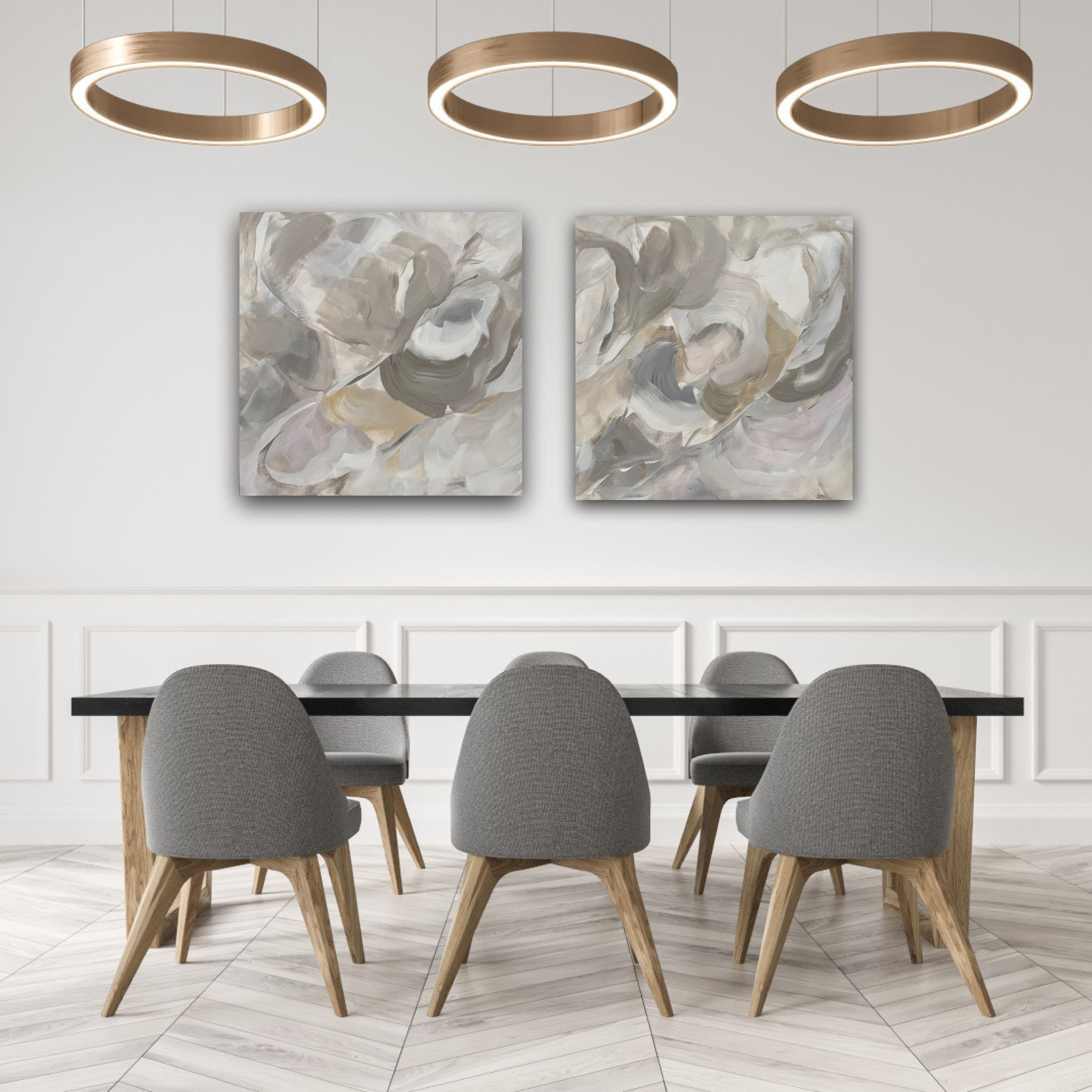 This diptych features soft, organic brushstrokes in a neutral palette of warm greys, beige and hints of muted gold. The fluid movement of the paint creates a sense of calm and sophistication making it a perfect piece for a modern space.