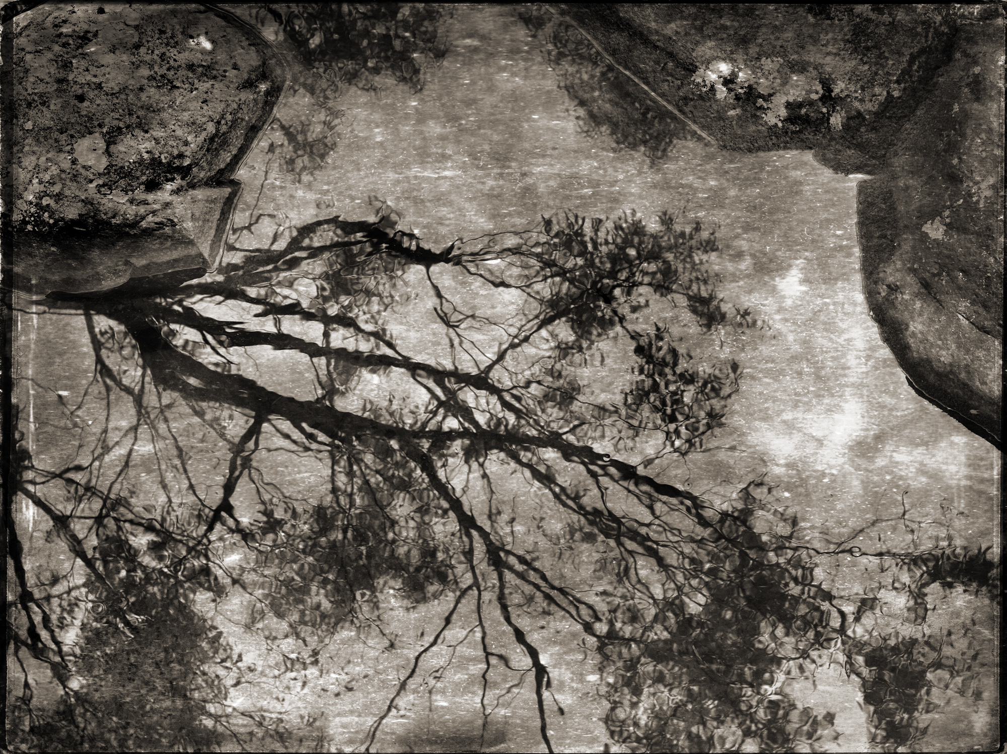 Striking semi-abstract monochrome view of a reflection of nature in a high-mountain rock pool, blended to enhance visual appeal. (See supplementary images showing detail and in situ views).