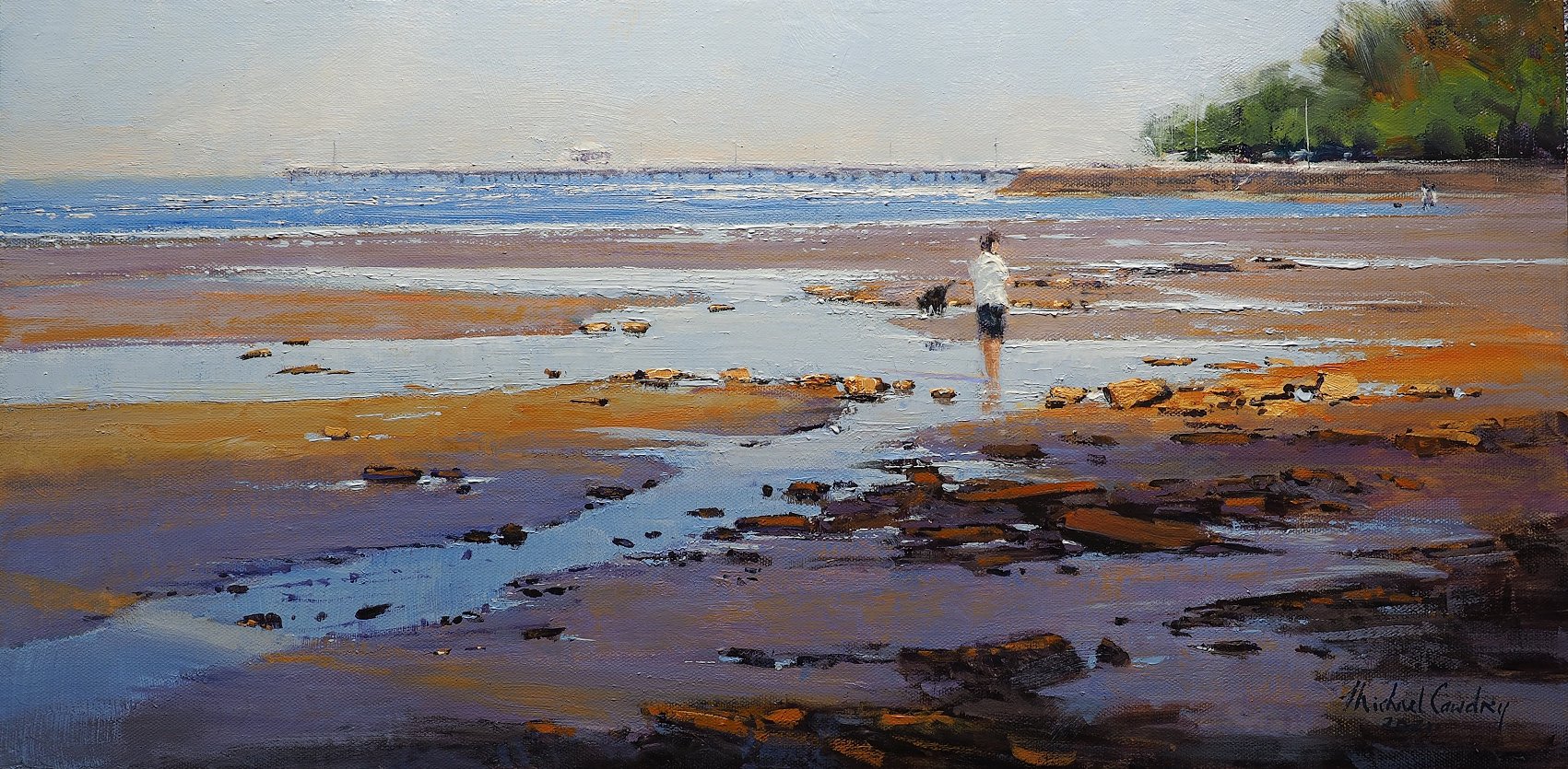 Afternoon shadows on the beach at Sandgate, Brisbane, with Shorncliffe Pier in the distance.