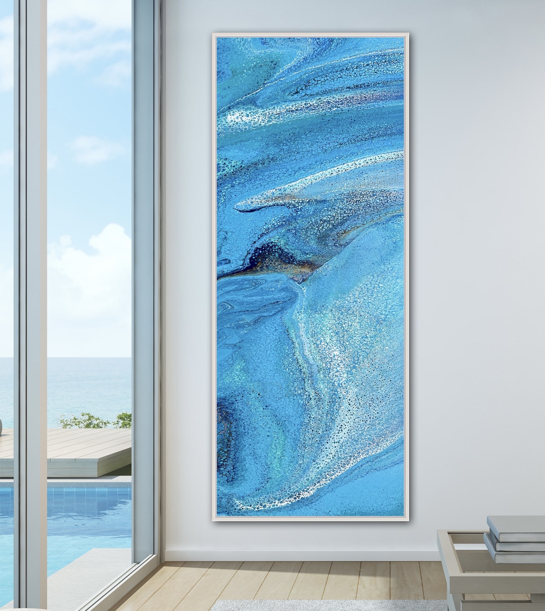 Shallow Waters was created using various techniques combined to allow increased flow, interaction and separation of colours to create interesting patterns where pops of colour can be seen emerging from underneath. This added dimension adds lace and cells to the artwork creating an interesting and one of a kind painting that can never be replicated.