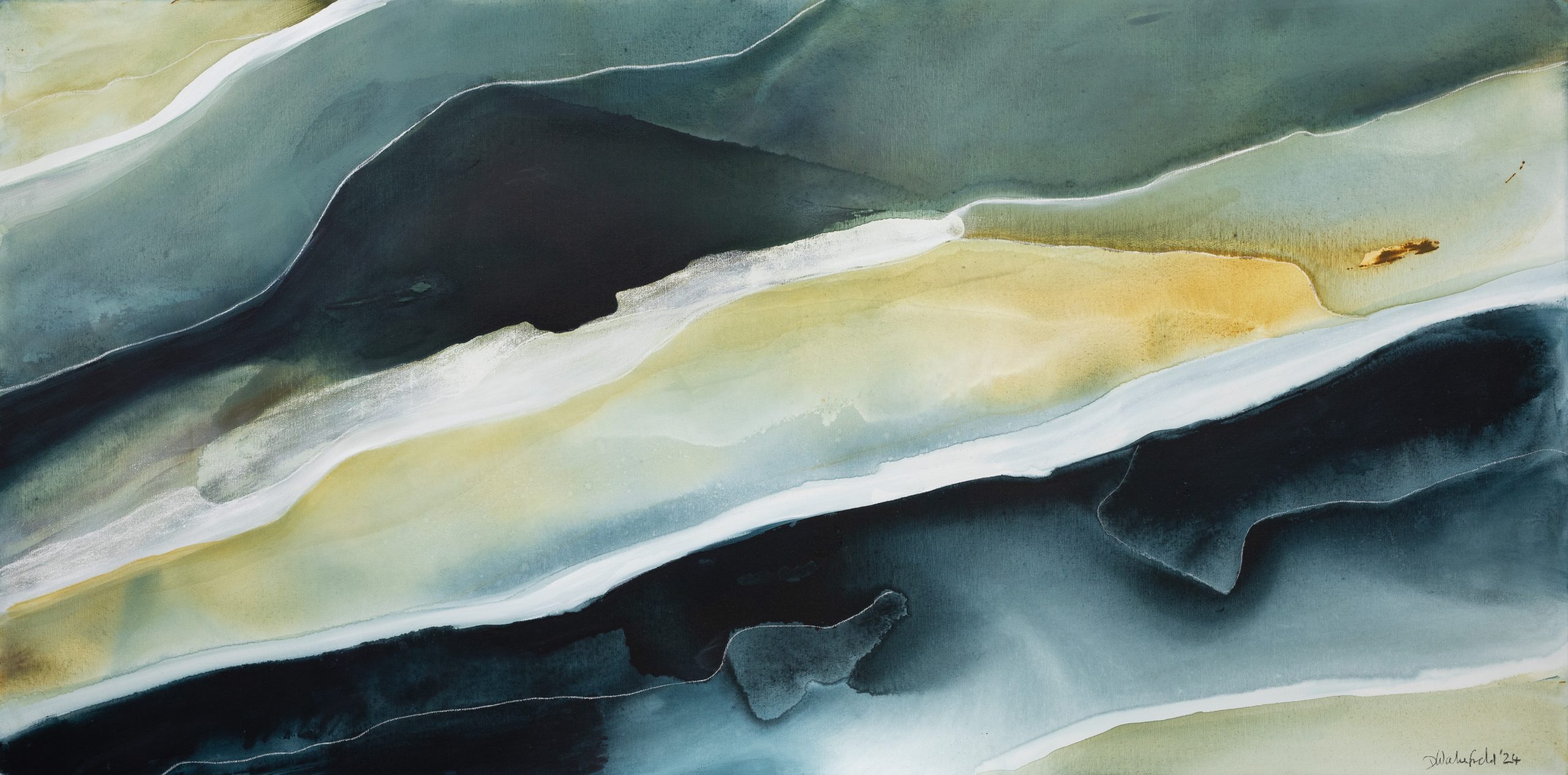 Shallow Waters by Dinah Wakefield is inspired by the light, the colours and the natural beauty of the Noosa region of Australia. “What I love most about Noosa is the interplay of light. From the oceans to the clouds, to the river estuaries and the hinterland, this canvas unfolds before me every day and finds expression in my paintings”.
