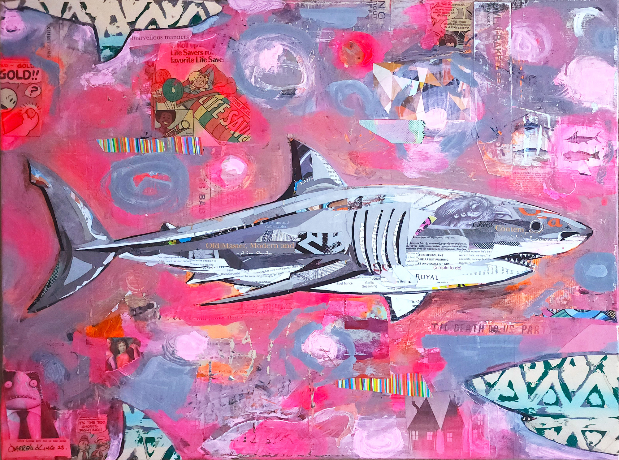 Screen print, collage and paint on canvas. The patterned shark silhouettes are made from screen prints on paper. The main shark is made entirely from collaged paper. The collage elements have been taken from junk mail, packaging, discarded books, magazines, maps and brochures.