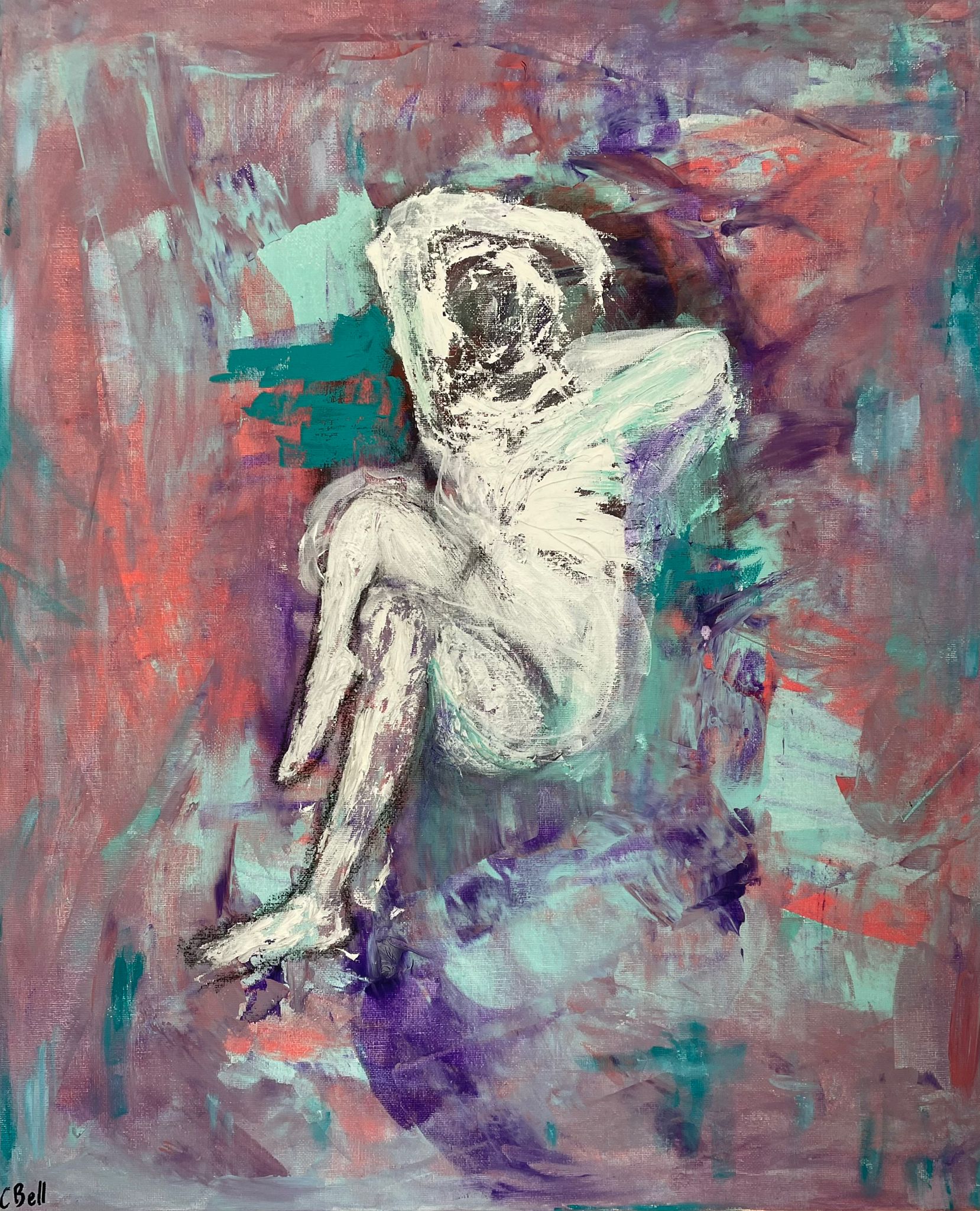 A very free abstract expressionist painting. This work captures the feeling of a woman awakening, not necessarily literally just her body, but also her dreams and desires.