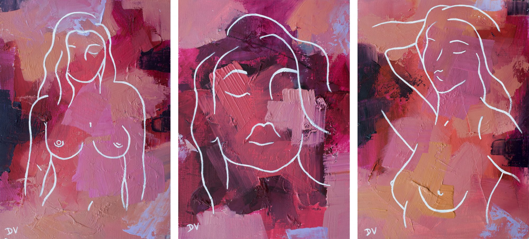 Influenced by the line drawings of Picasso and Matisse, I have endeavoured to capture the elegance of the female form as simply as possible. These began with a series of ink drawings on paper. This time I decided to first build layers of abstraction. The three line drawings are slightly more detailed than previous artworks, yet the background is less detailed.