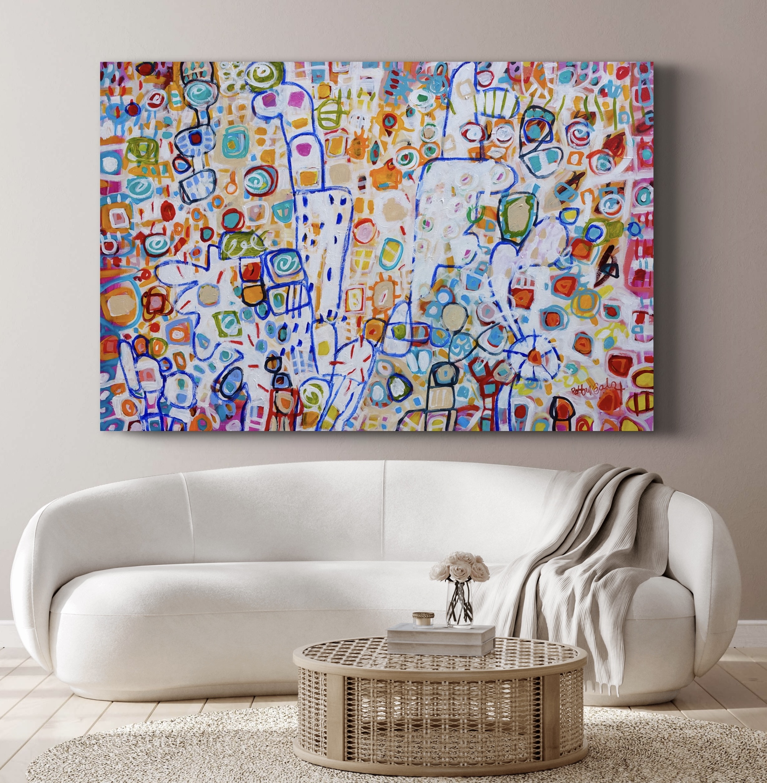 The work is sealed with a conservationist Gloss Varnish which is essential as it doesn’t yellow or crack with light and age and means that you can wipe the painting free of dust with a damp cloth if you need to which will also preserve its life. The painting continues on the sides so if you hang the painting stretched without an exterior frame it will still look lovely from any angle. I hang all work in my home without an exterior frame as I feel it allows the painting to continue beyond its borders in my mind. However I have included a few images with a frame to show you what the work would look like framed.