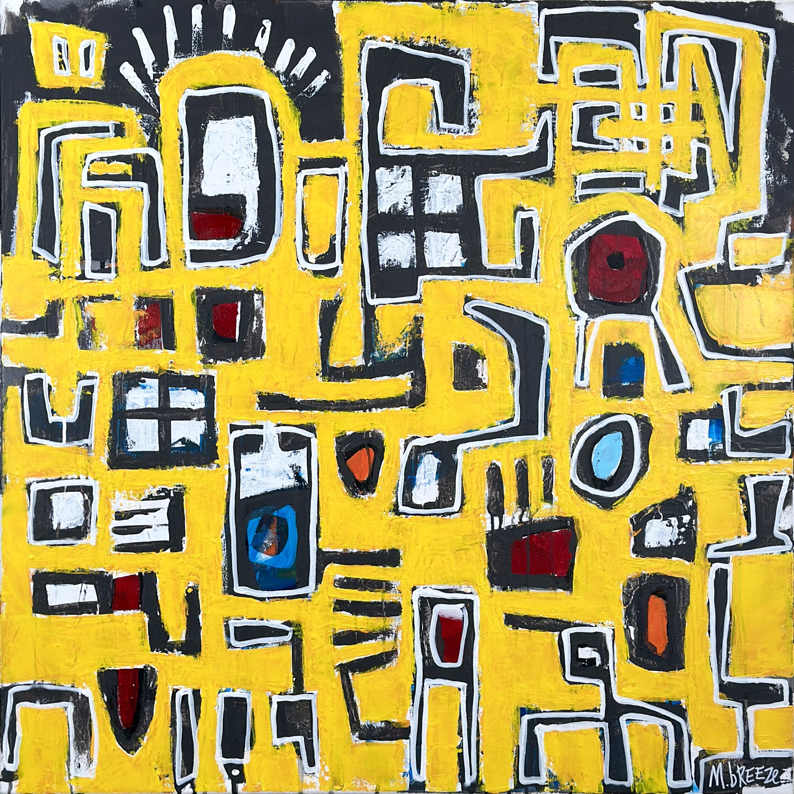 Original artwork using acrylic paints applied with trowel, hands and brush on to stretched canvas.