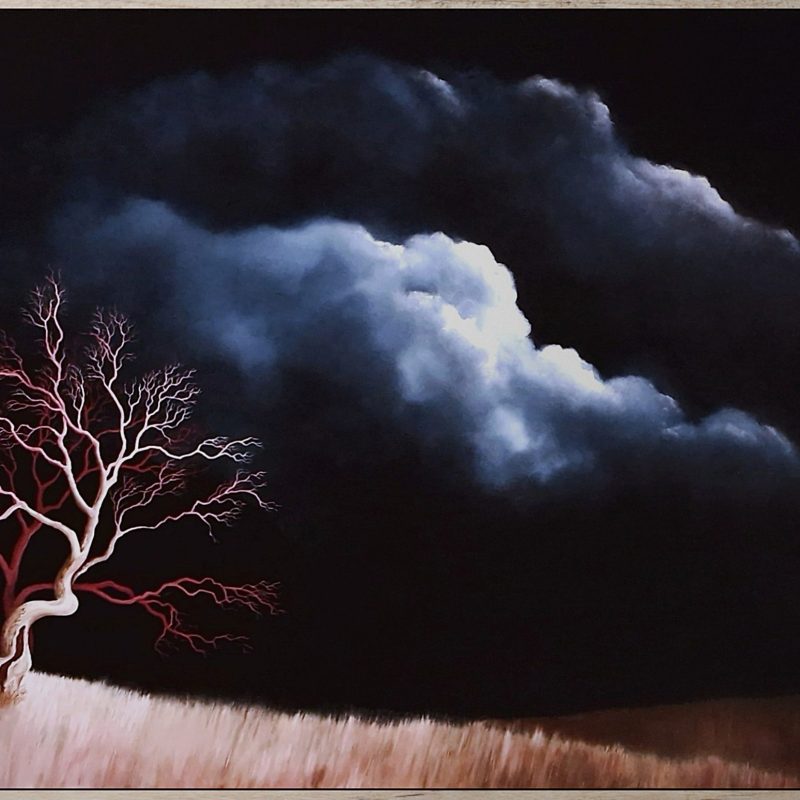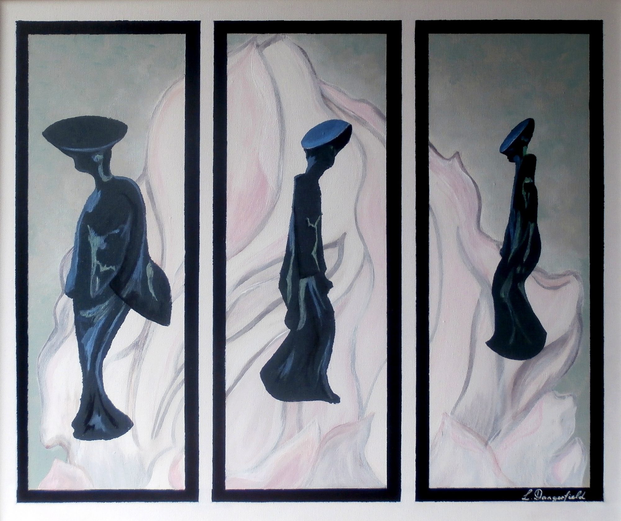 She – I am ever on the lookout for inspiration for my paintings. This one came when I was visiting friends on the NSW South Coast, when I noticed a small figurine on their window ledge. The simple, elegant lines so impressed me, that I just had to create a painting using her as my main subject. I decided to depict her as though she was turning and walking away from the viewer. I opted for pastel tones in the background to add contrast to the dark figure and the frames on the three black panels that depict her as she moves away. A combination of representational and stylised form, together with the simple lines and a limited colour palette have enable me to achieve the serene, elegant image I had envisaged.