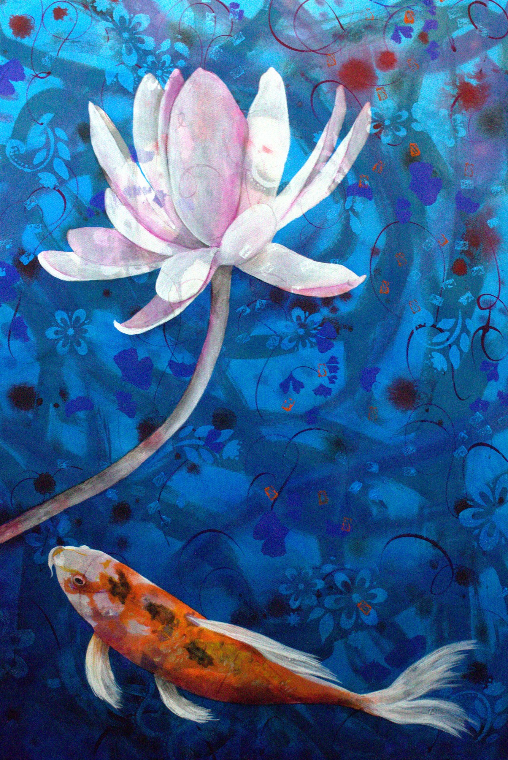 Sheltered by the Lotus by Michelle Gilks – Captured in a dream-like state, this peaceful koi swims effortless through the pond water. A beautiful white water lily floats above, adding to the serene, meditative quality of this artwork.