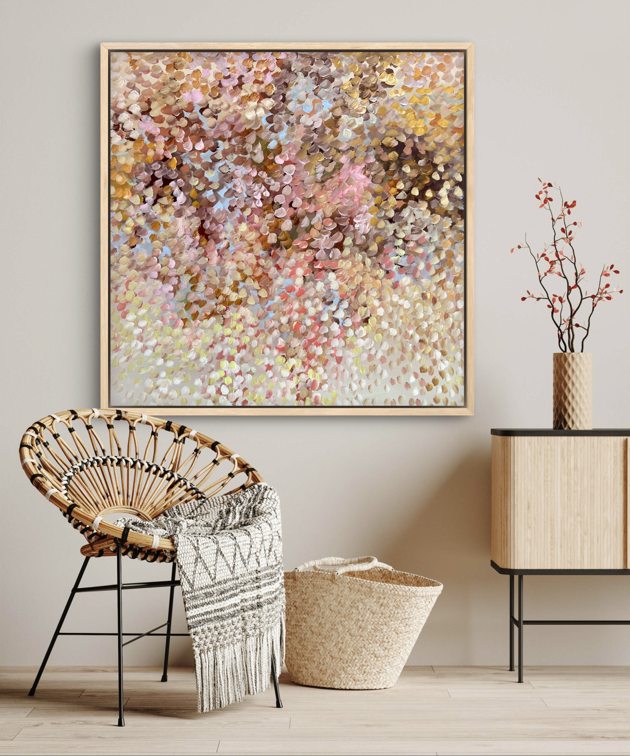 A painting with warm and cool colours of flowers and petals flying in the wind creating weeping over the landscape with lots of layers of acrylic paint. Petals weeping over the landscape creating so much movement and rhythms . A very peaceful and tranquil painting with so much depth. The painting does not come with an external frame.The painting is signed and dated at the back and comes with a certificate of Authenticity.